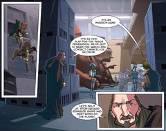 Obi-Wan questioned why they were personally purviewing the bills, and Jinn replied that they were listening so they could act when they needed to. Obi-Wan teasingly asked if they would act with or without orders, which made Jinn smile, though the Jedi Master informed his apprentice that they were likely to be following orders. Kenobi quipped that, because they would be under the Council's alignment, they would be less likely to be involved in local labor disputes. Bothered by Kenobi's comment, Jinn rebuked that they would also be less likely to kick-start romances with the local nobility. The reference to Duchess Satine let Kenobi know better than to treat such things so trivially, and he changed the subject as they continued reading the taxation bills. Jinn's precautions proved useful as[16] Chancellor Finis Valorum dispatched Jinn and Kenobi to Naboo, tasking them with resolving the situation through diplomatic means.[4]