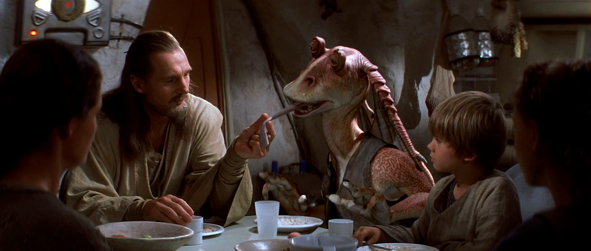 Jinn chides Binks during a meal with Skywalker and his mother.