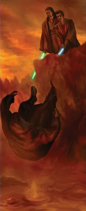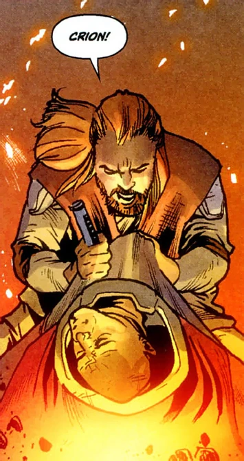 Fighting through the governor's guards, Jinn soon reached Crion himself, who was armed with a sword and a blaster. Suddenly, Tamarik appeared at the scene against Jinn's orders and joined the fight. She was quickly disarmed by Crion, who prepared to kill her. Determined to protect the young Padawan, Jinn struck Crion with his lightsaber, making him lose his balance and fall into a pool of hot embers located at the lower level of the palace. The Jedi Master followed the governor there, trying to wake him as he landed, but Crion was already dead. Enraged by his father's death, Xanatos attacked Jinn, knocking his Master's lightsaber out of his hands; the weapon fell into the fiery ashes and was destroyed. Xanatos confronted the defenseless Jinn, who tried to plead with his Padawan, but the boy had fallen to the dark side of the Force and did not listen. Having regained her lightsaber, Tamarik tried to protect Jinn, but Xanatos easily parried her attacks. Jinn then Force-pulled Tamarik's lightsaber and engaged Xanatos in a duel. During their fight, Xanatos accused Jinn of murdering Crion. He then took his dead father by the hand and pressed Crion's ring—bearing their family symbol, a full-circle—to his right cheek.[34]