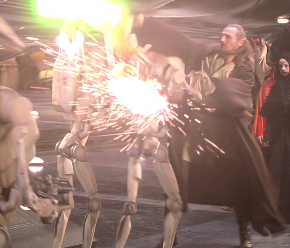 Ataru was not Jinn's only fighting style, and he had learned other forms of lightsaber combat, possibly to better handle the weaknesses of Form IV. Being apprenticed to Dooku, the most renowned fencer of the time, it is apparent that Jinn learned the classical dueling form of Form II/Makashi from his master and he was versed enough to effectively incorporate its maneuvers into his dueling style.[182] Not only was Form II more effective against a single lightsaber-wielding opponent,[183] but it was also more grounded,[18] as demonstrated in Jinn's duels with Darth Maul.[3] His knowledge was also good enough that he apparently taught Xanatos how to use Makashi. He seemed to have been well-trained in Form V/Shien and Form III/Soresu, as he could easily handle blaster-wielding opponents.[3] When he and Kenobi fought Taxer Sundown's hypnotized soldiers, who were wielding training lightsabers,[87] he displayed a level of mastery of Form I/Shii-Cho shared with Kit Fisto, albeit at a lesser degree.[18][184] Qui-Gon is also skilled in Form VI/Niman were he helped Obi-Wan studied Niman during his apprenticeship.[source?]