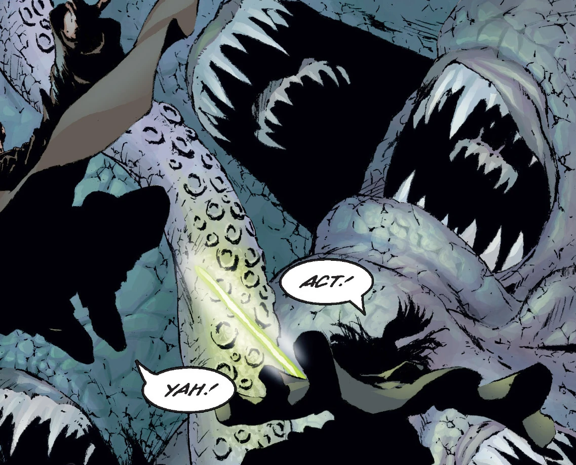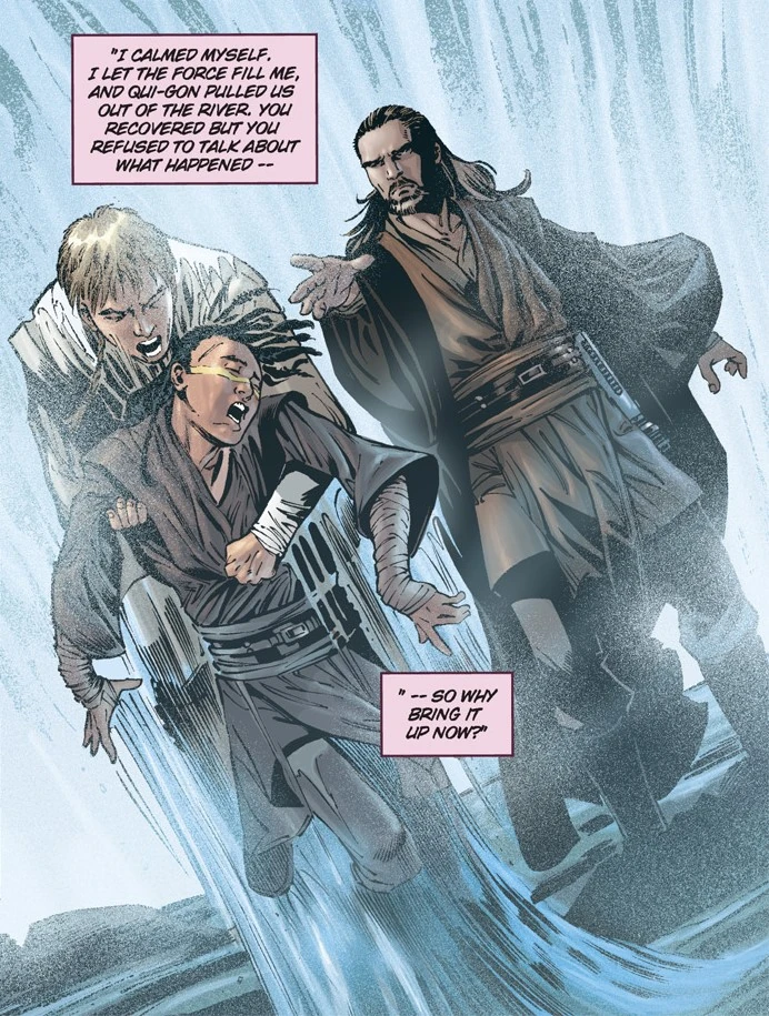 Later that day, still angered by Jemba's actions, Kenobi offered to assassinate the Hutt, but Jinn explained him that killing was not the Jedi way. The recent events left Kenobi with an impression that Jinn was reconsidering to take him as a Padawan, but the Jedi Master denied that again. That time, however, Jinn suddenly felt incredibly sorry for Kenobi, as he realized that he had finally crushed the boy's dreams at becoming a Jedi. During the night, Jinn tried to concentrate on healing his body, but time and again he found his thoughts returning to Kenobi. As a result, he slept restless and woke up early, witnessing a yellow haze coming from the nearby hills, but before he could figure out what that was, he saw the Arcona panicking. One of them informed Jinn that a tide was coming in, one that could easily swamp the ship. Because of that, everyone needed to evacuate into caves located in the hills. Jinn then suddenly realized that the yellow haze was coming from the stolen dactyl that had been hidden by Jemba in the caves.[23]