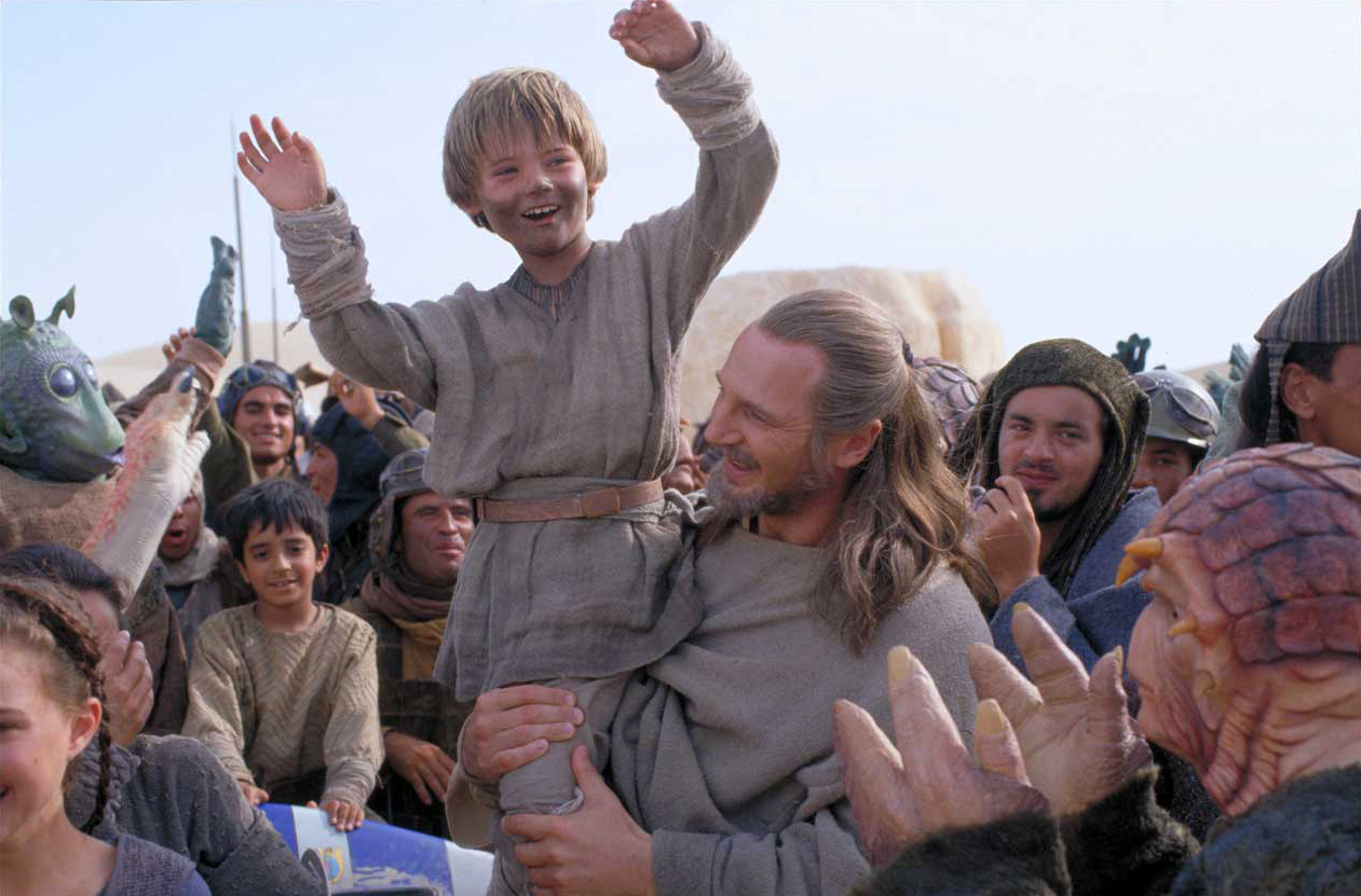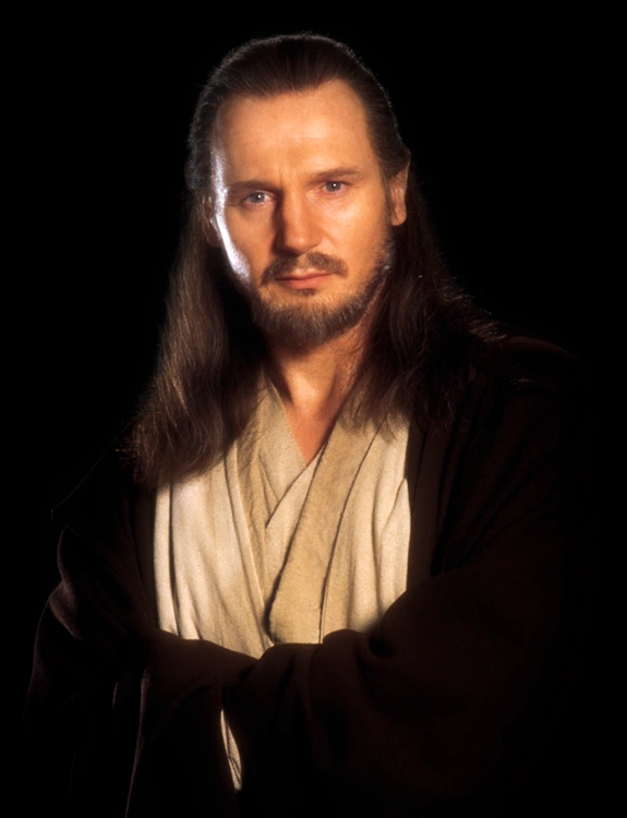 Qui-Gon Jinn was portrayed by Liam Neeson in Star Wars: Episode I The Phantom Menace. As revealed in The Art of Star Wars Episode I: The Phantom Menace, George Lucas conceived Jinn's character during pre-production of The Phantom Menace. This is shown by concept art where Kenobi is shown alone in the Federation ship and while meeting Binks. Even when Jinn was conceived, Lucas toyed with making him the younger Jedi, as shown in concept art depicting Kenobi as an old man.