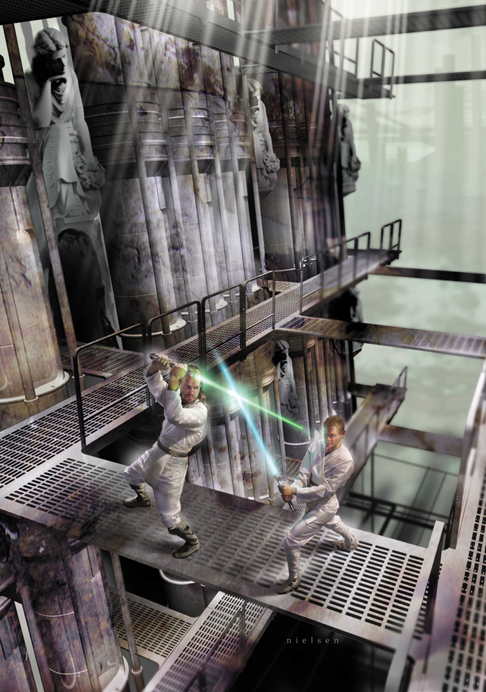 The duel features extra posturing on Darth Maul's part, with him bowing twice to the player. They then duel, heading out of the hangar and into the power chamber. The player chases Maul around the catwalks and duels him on an energy bridge, before leaping down a set of rings and dueling Maul on the central catwalk. Maul Force-jumps away from the player, who chases the Sith Lord. In the next section, they face three battle droids and take an elevator up. On the upper catwalk, the player faces two more droids and must jump across a series of gaps which feature oscillating lasers. Once past, the player must disable two fans. They then disable a third fan and start jumping down its five levels, disabling more fans on the way down. The player ends up on the bottom of the power chamber and must avoid falling into the pool. Past that is a laser gate maze, which is guarded by more droids. The next section past the maze is a series of gaps which the player must jump over, while also avoiding the lasers. Once across, there is a short duel with Maul which is similar to the movie. If Jinn is a playable character, he can beat Darth Maul outright and appear in the victory celebration after the invasion was over. This article assumes the last mission is non-canonical.