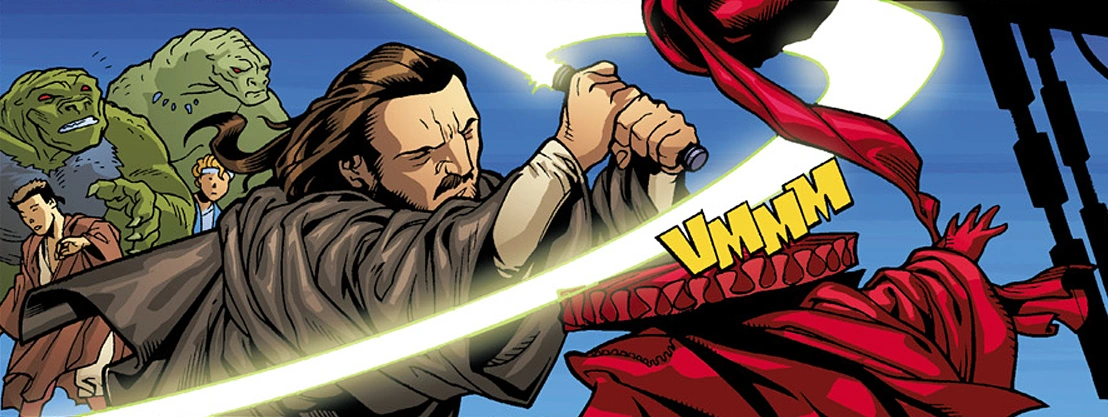 Nevertheless, Kenobi could not find any proof of Offworld's involvement in the thermocoms' theft. Furthermore, Clat'Ha explained that Kenobi's efforts were in vain, since the missing thermocoms had been found lying in a barrel of lubricant. Unbeknownst to the others, it was Jemba who had in fact stolen them, but after Kenobi had come looking for the parts, the Hutt had decided to discreetly return the thermocoms back. Jinn rebuked Kenobi, telling him that his intervention could heat up the tension on the ship. At that moment, the Monument started shaking, having come under attack by several pirate warships. Jinn quickly ordered Kenobi to check if the Monument's pilots were still alive, and if they were not, to take the ship's controls and get them to safety, while he distracted the pirates. Making a stand in one of the ship's corridors, Jinn, assisted by Clat'Ha, managed to hold off the invading vicious Togorian pirates for some time, but he was eventually slashed across the back of his shoulders and down to the ribs by the pirate captain's vibro-ax. Moreover, one of the pirate ships opened fire, breaching a hole in the Monument's hull near the site where Jinn fought the pirate.[23]