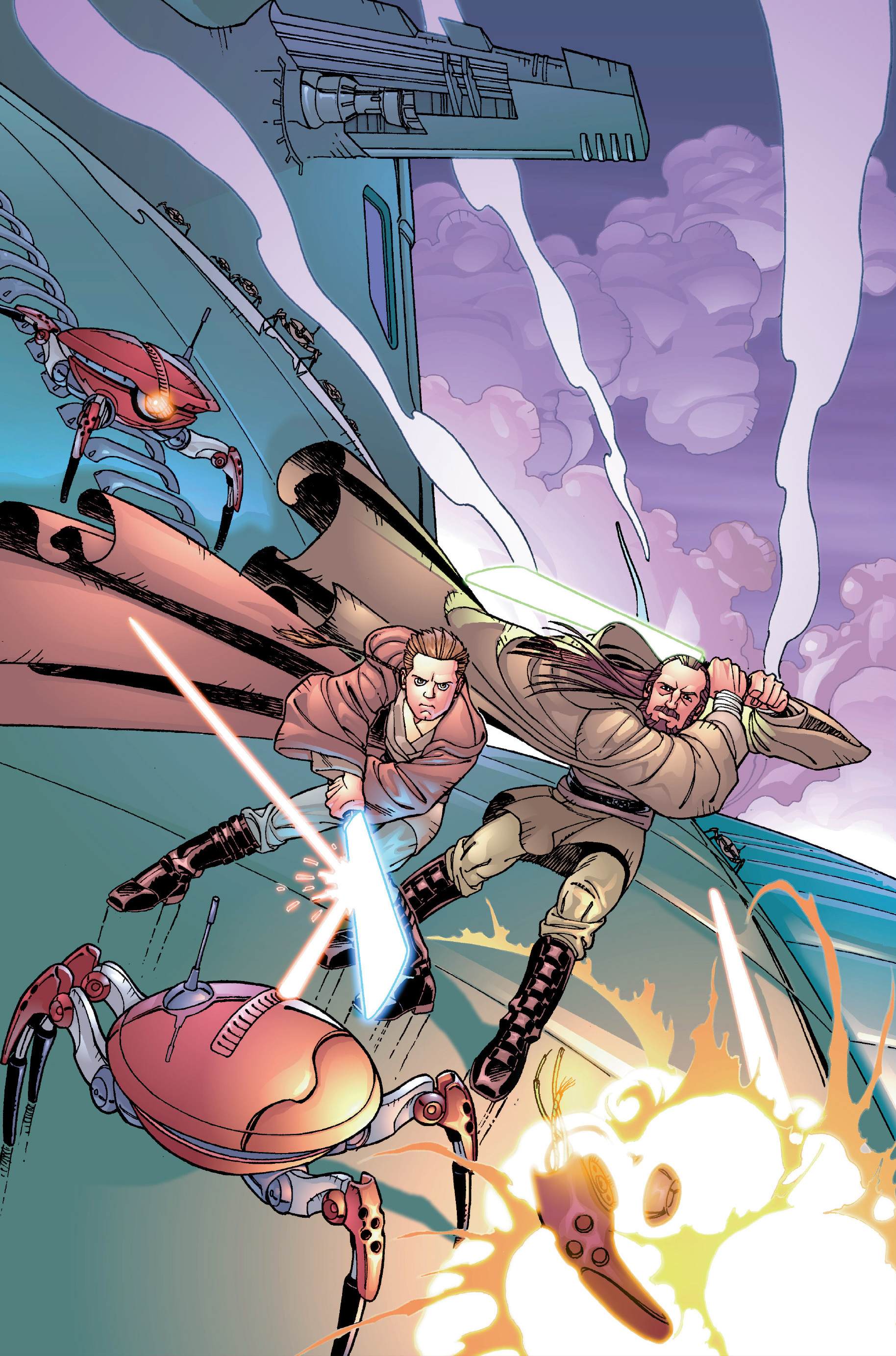 The video game Star Wars: Episode I Jedi Power Battles, which can be played with one or two players, featured Jinn as one of five playable characters. As the game takes place during the events of The Phantom Menace, this article assumes that the two playable characters are Jinn and Kenobi. The levels Trade Federation Battleship, Swamps of Naboo, City of Theed, and Theed Royal Palace take place from the start of the movie to the Jedi's departure on Theed. The first mission starts just after Jinn's and Kenobi's escape from the conference room aboard the Trade Federation flagship. They travel through the corridors and engage a large group of battle droids before finding a command center. They then travel on a conveyor to a hangar and duel a Cargo Loader Droid. They then continue through the ship and duel a droid starfighter. The next mission takes place in Naboo's swamps, after the Jedi meet Binks.