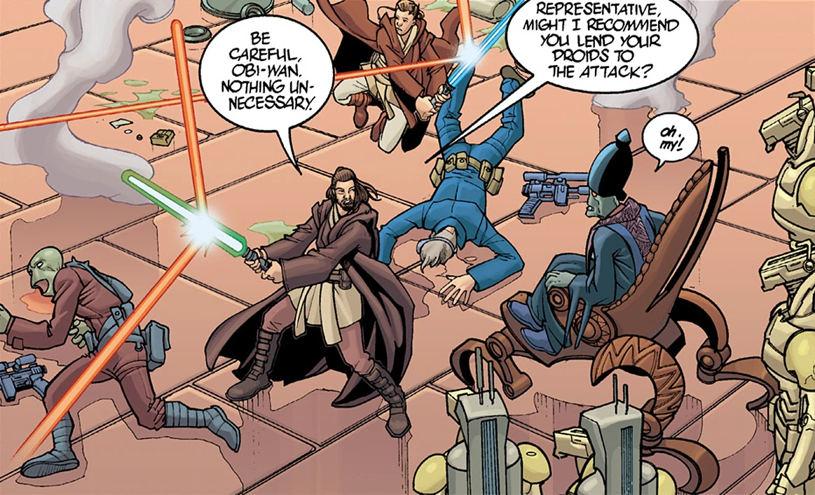 After they reached Von-Alai and entered the factory, Jinn, to his shock, discovered that child labor was being practiced there, which was forbidden by the Republic laws. Jinn tried to convince his Master that they had to help the children, but Dooku was preoccupied only with their mission. Confronting one of the factory's managers, Dooku threatened him with a promise to report all the violations he had seen and to shut down the production. Under those threats, the man revealed the name of the corporation that owned the factory, Caravan, which Dooku recognized as the name of Nod's model ship he had built at the Temple. As Jinn and Dooku turned to leave the factory, they were surprised to find Iridian waiting for them, who claimed that he had followed them in order to help them find Annon. The aide said that he had found a worker who might know where the pirate's hideout was. The Jedi followed Iridian, but the aide wandered away and disappeared, and the Jedi were instead confronted by several Eradicator-series battle droids. The Jedi ignited their lightsabers, but after Jinn realized that a battle inside the factory could harm the children who were working there, he deactivated his weapon. Dooku was determined to fight, however, and Jinn had to convince his Master to stand down. Grudgingly, Dooku followed his Padawan's example, and both Jedi were taken into custody by the battle droids.[8]