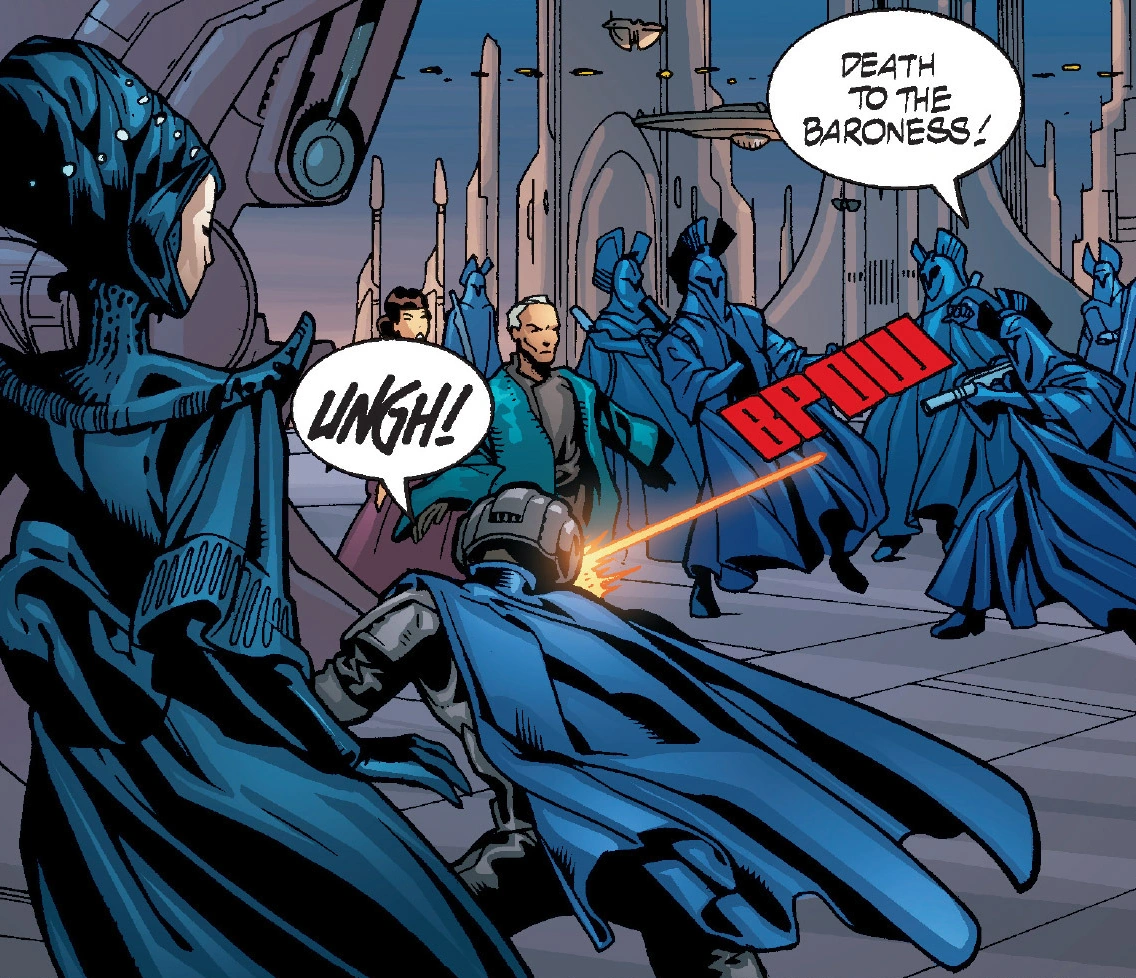 The two engaged the droids, but the machines used smoke grenades, covering everything in sight with smoke. Suddenly, Joli's voice was heard again, begging the Jedi to rescue her and saying that she was forced by the pirate to stand on his ship's ramp. Despite Dooku's urging not to listen to her, as that was most likely another ruse, Jinn risked his life and fought his way to the ramp to save the girl. Dooku soon caught up with him, and they boarded the pirate ship. Inside, however, they found only a recording rod with Joli's prerecorded voice. Realizing that the pirate had already slipped aboard the cruiser, Jinn and Dooku hurried to a safe room, where Iridian had been supposed to take Annon to in case of any potential danger. Inside the room, they found Iridian lying unconscious and Annon nowhere to be found. Returning to the docking bay, they saw Annon in shackles, being pushed into the enemy ship by the pirate, whose face was hidden behind a helmet. At the same time, the cruiser's systems began to fail because of the damage the ship had sustained during the battle. The two Jedi leaped onto the pirate ship's ramp; Dooku deflected the pirate's blaster shots with his lightsaber and began slowly advancing on him. The pirate, however, performed a maneuver that disoriented Jinn's Master. The pirate managed to slip into his ship and raised the ramp, causing both Jedi to fall on the cruiser docking bay's deck.[8]