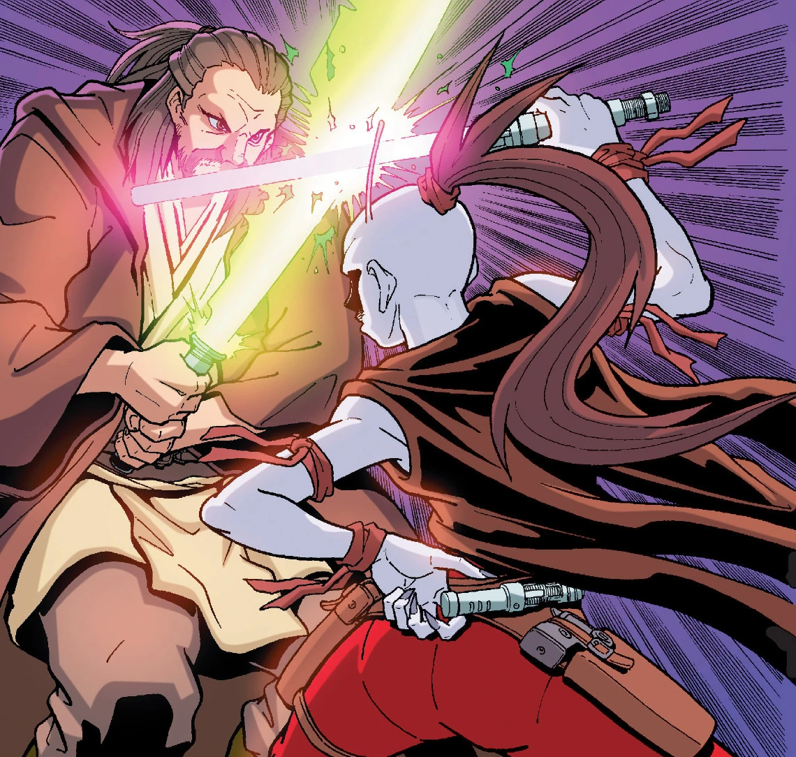 Jinn was incredibly skilled in the fourth form of lightsaber combat, Form IV/Ataru, being considered one of the greatest masters of the form among the Jedi. In combat, his bladework was wide and powerful, marked by heavy, two-handed slashes and sudden flourishes to cover his flanks. Jinn's mastery of Ataru was such that he could easily defeat blaster-wielding opponents despite the form's weakness to blaster fire.[3] Rather than engaging in the energetic acrobatics typical of most Ataru specialists, Jinn, at least in his later years, tended to stay grounded during lightsaber duels.[3] That being said, he remained fully capable of utilizing acrobatic attacks and maneuvers during combat.[36] Jinn was also capable of effectively employing unarmed combat strikes into his lightsaber sequences.[3]