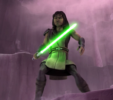 It was on one such mission that Vos met Aayla Secura, a Twi'lek who displayed a sensitivity to the powers of the Force. During the mission, Vos rescued Secura from a dangerous area on her homeworld of Ryloth.[10] The maverick Jedi took Secura as his Padawan,[1] and the two formed a close relationship.[9] Under the guidance of Vos, Secura later became a Jedi Knight.[1]