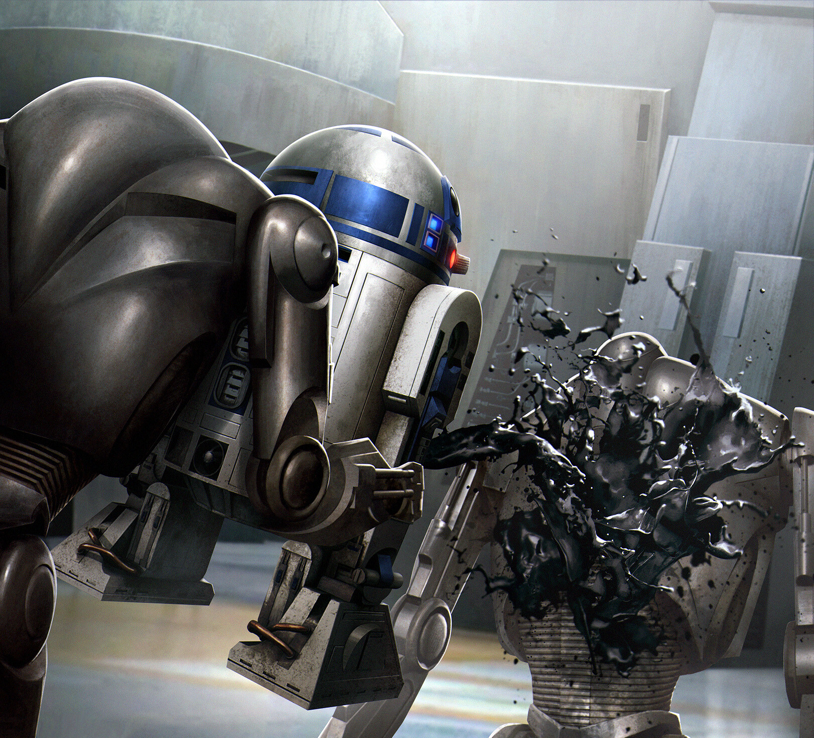 R2-D2 dueling with the Separatist droid R3-S6.