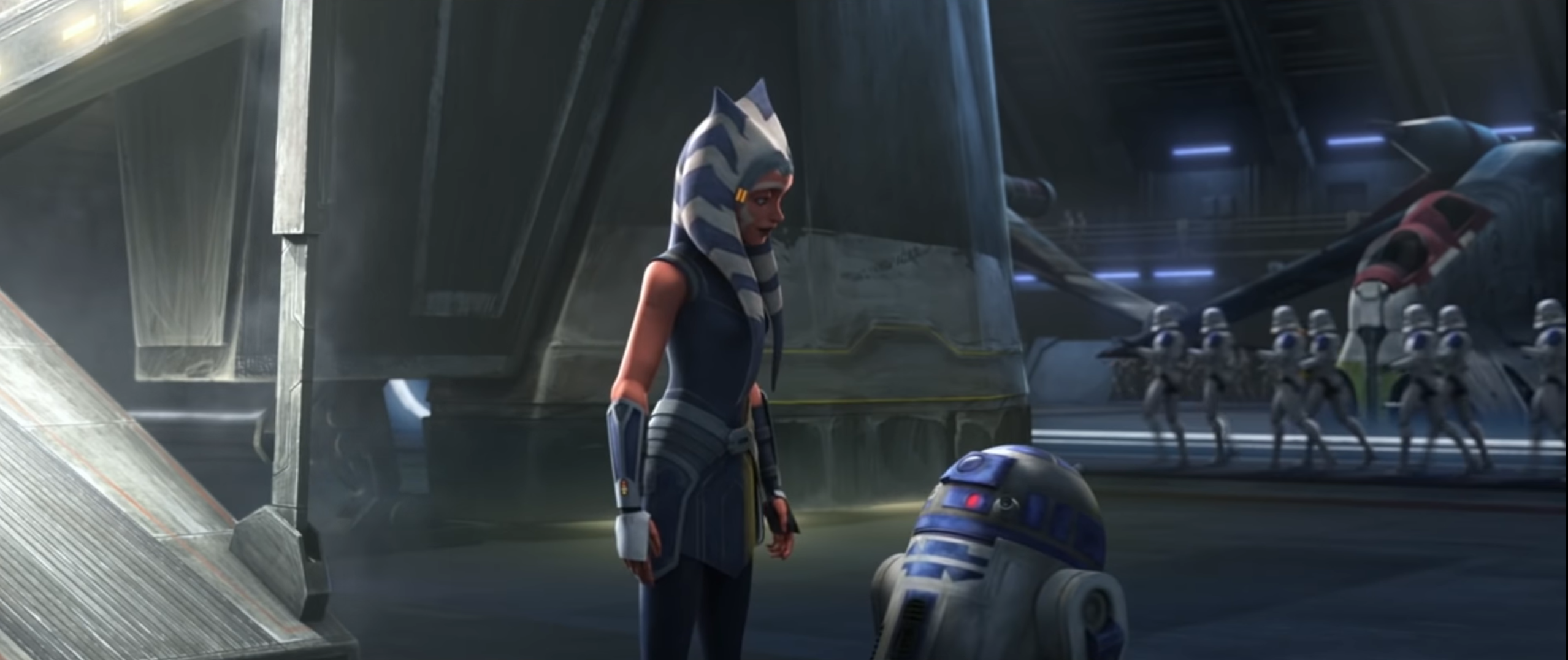 R2-D2 with Anakin Skywalker and Obi-Wan Kenobi when Anakin and Ahsoka Tano first met.
