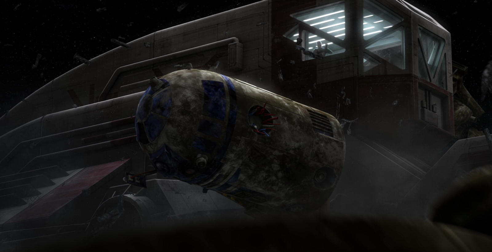 R2-D2 came up to the bridge and found Skywalker and Windu had survived the blast, but were trapped under the rubble. When R2-D2 attempted to move the debris, he caused the bridge to shudder. Skywalker warned R2-D2 to stop trying to free them. Instead, he instructed the astromech to return to their Jedi starfighter and contact the Jedi Temple on Coruscant for help. While leaving the bridge, R2-D2 was pursued by Boba Fett's bounty hunter associates including Aurra Sing. He managed to escape, and delayed them by using debris to block them.[52]