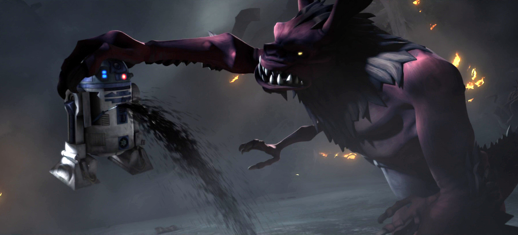 Before the monster could devour the ship, Skywalker managed to use his lightsaber to cleave the vessel in half; sending the bow along with R2-D2 and the other passengers plummeting into the Senate Building. R2-D2 managed to activated his booster rockets and rescue C-3PO. The astromech droid also used a tow cable to attach himself to the other side of the building. R2-D2 was forced to drop C-3PO to rescue Palpatine. Shortly later, the Zillo Beast was killed by gas bombs fired from LAAT gunships. Due to this quick intervention, R2-D2 survived the Zillo Beast incident and continued serving Skywalker.[51]
