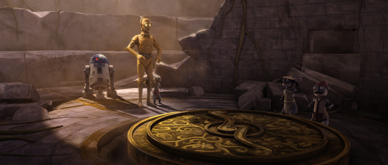 When C-3PO agreed to help fix the damage, Orphne gave the droids a parting riddle. R2-D2 quickly deduced that Orphne was referring to a river and used the water seal to activate a water spout that sent the two droids and the chamber's central floor plate back to the surface. The two droids landed at the opening where they were greeted by a chanting crowd of Aleena. Recalling the riddle, two droids quickly realized that they had to fix the breach, which was in fact the unsettled seal. Together, R2-D2 and C-3PO closed the seal which brought an end to Aleen's earthquakes. While Wolffe and his clone troopers were skeptical of their story, the two droids' efforts were greatly appreciated by the Aleena.[55]