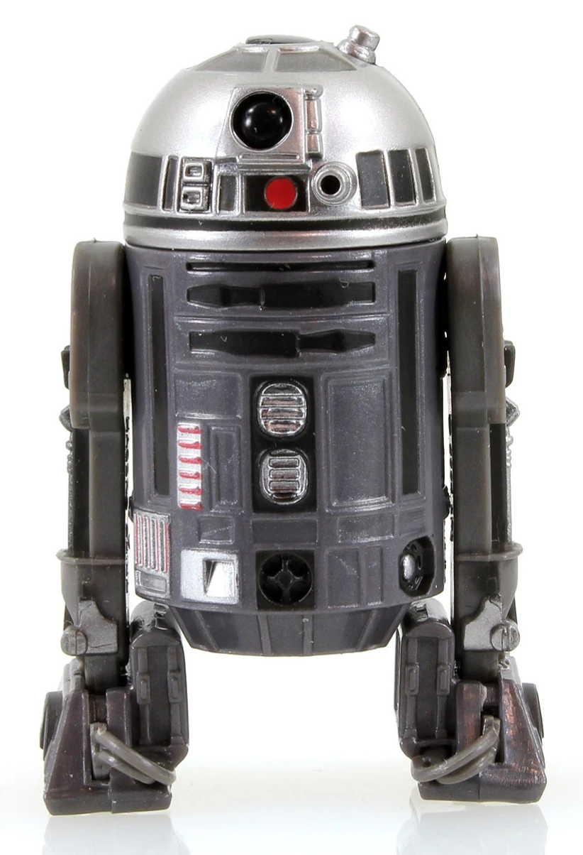 R4-K5 is presented inconsistently in terms of color across sources. In the 2005 reference book The New Essential Chronology, in which the droid was first pictured, R4-K5 is seen as having a black dome, with a white body.[3] Later, several Hasbro figures of the droid portray R4-K5 with a dark-gray body, silver dome, and black panels,[2][10] or alternatively with a purple body.[11] In the comic Darth Vader and the Cry of Shadows 4, R4-K5 is shown with a black body with silver tool panels.[6] This article treats the version of R4-K5 depicted in the StarWars.com Databank as the correct one.[1]