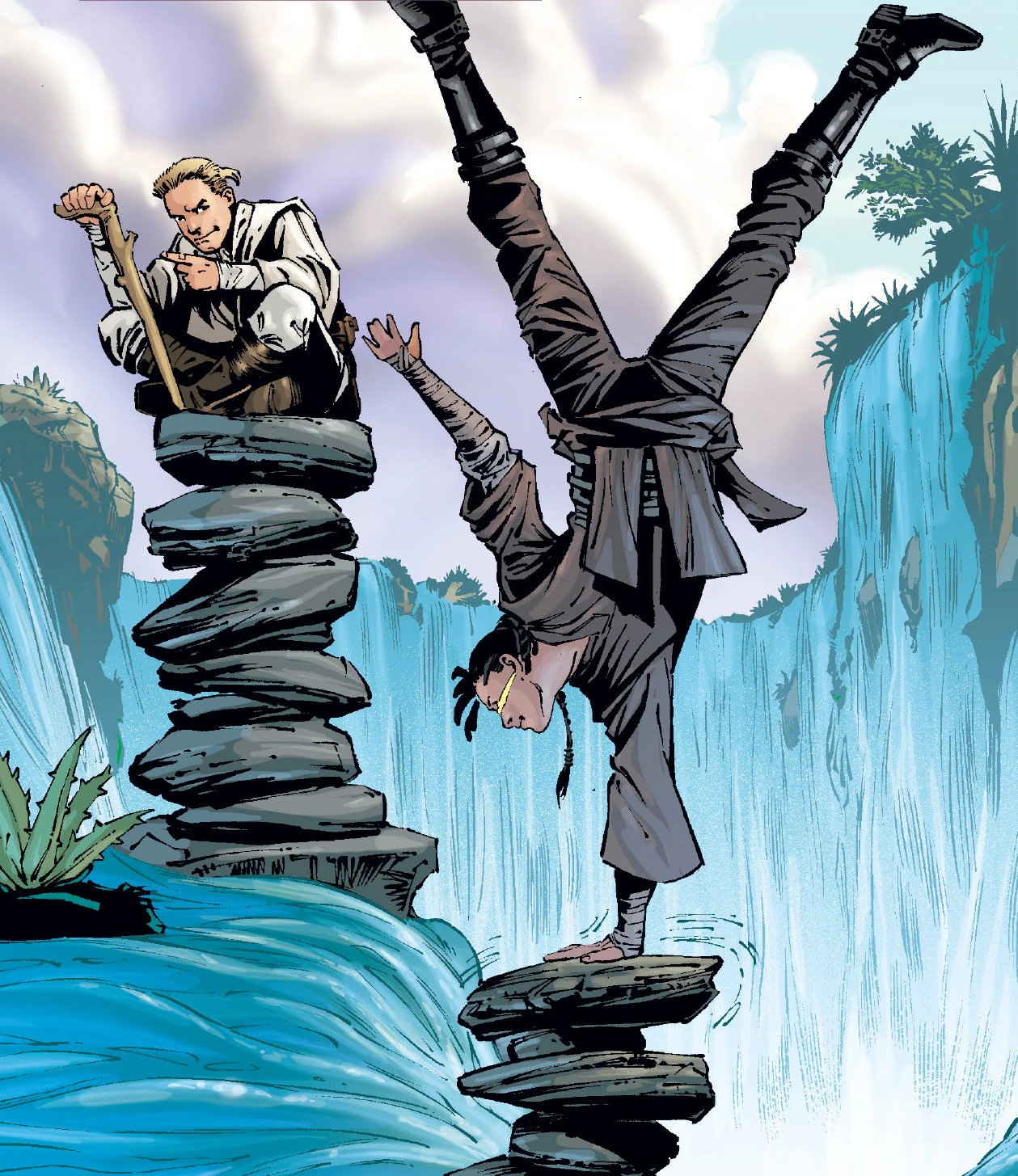 Years later, just after the Stark Hyperspace War, Jinn and his padawan Obi-Wan Kenobi were accompanied to Ragoon VI by Master Tholme's padawan, Quinlan Vos, to complete a survival-training mission. The boys—nearly drowned by a vortex of churning waters—were rescued by Jinn, who called upon the Force to lift them from the whirlpool.