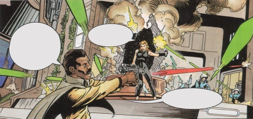 Lando, Jade and Bel Iblis were surprised by the team's rear guard and began shooting. Lando had the idea of using the Millennium Falcon to rescue the Solo's from the window and went down to the hangar. Meanwhile, Palace Security arrived and brought an E-web to quickly eliminate the team. Unfortunately, it wouldn't get there fast enough before the commando's would have hostages. Mara Jade, using her knowledge of the Emperor's hidden passages, decided to ambush the commando's from a different direction. She killed several commandos before sending a second message through the Force, telling Leia to surrender.