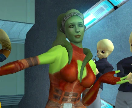 Ramana was a green-skinned female Twi'lek who lived during the Old Republic era. Ramana was enslaved by a male Twi'lek, Doton Het on Telos IV after her partner Harra traded her away in a lost bet. Ramana was enlisted as a dancer in the Cantina on Telos IV, being made to dance on the stage along side a band made up of Bith.[1] Though Harra eventually wanted Ramana back, enlisting the aid of Meetra Surik who freed Ramana though a wager game of Pazaak. Ramana came back with Surik to Harra, though Ramana would not stay with Harra. Surik allowed her to leave and go wherever she wished, much to Harra's surprise.[1]
