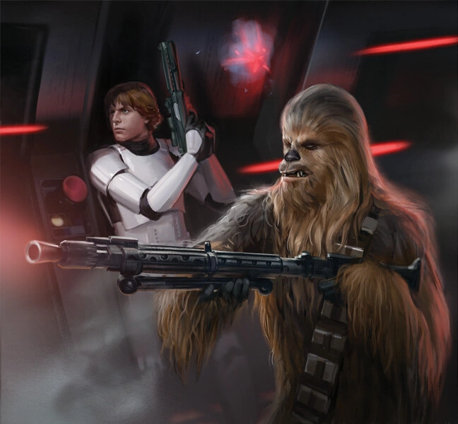 Solo and Skywalker, disguised as stormtroopers, along with Chewbacca proceeded to take over the hangar's control room, killing two officers in the process. Once inside, Kenobi instructed R2 to log into into the Imperial network to locate the tractor beam's power supply. From there Kenobi left to switch off the tractor beam controls, leaving the others to wait in the control room. However, it was not long before R2 discovered that Princess Organa was being held prisoner on-board and awaiting execution. With some coaxing, as well as the offer of a generous reward, Skywalker managed to convince Solo to participate in a rescue attempt. Skywalker's idea was that they, disguised as stormtroopers, "arrest" Chewbacca as a fake prisoner and attempt to "exchange" Organa with Chewbacca. Chewbacca snarled at Skywalker when he attempted to cuff him, resulting in Solo cuffing him instead, realizing what Skywalker was thinking. However, Solo expressed his doubts about the plan actually working.[1]