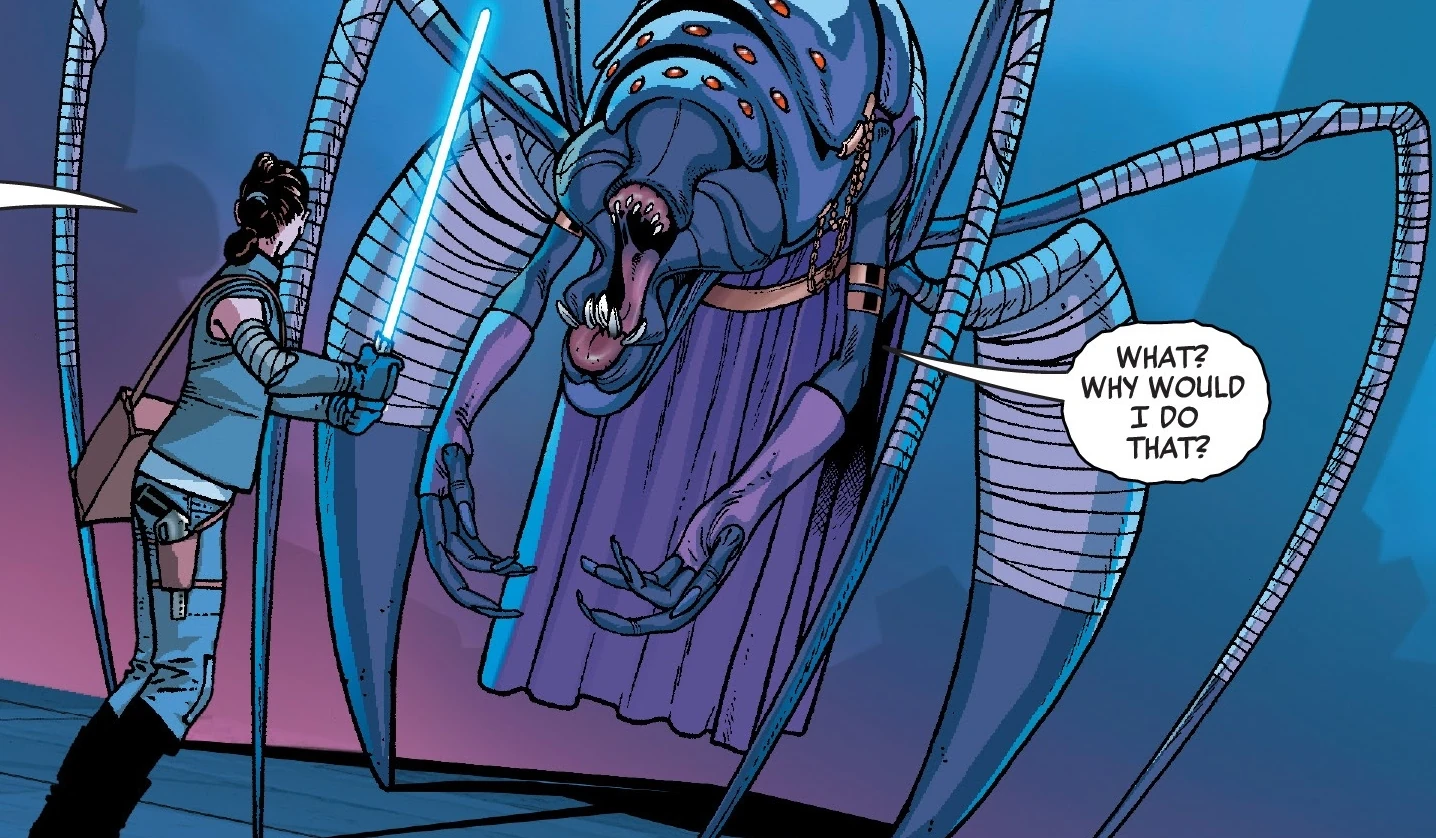 The Eravana was soon boarded by the both Guavian Death Gang and Kanjiklub, two criminal organizations that Solo had swindled into loaning him money so he could smuggle rathtars to King Prana. Rey and Finn hid in the corridors beneath the floors as Solo unsuccessfully tried to talk his way out of the situation, and his predicament gave Rey the idea to shut all of the doors between the Corellian smuggler and the two gangs. She accessed the wrong door controls, however, and accidentally unleashed the monstrous rathtars, which ran loose across the ship. As Rey and Finn ran from the beasts, one of them grabbed Finn and carried him away. Rey found a control panel that allowed her to close a door onto the tentacles of the monster, severing the limbs and allowing Finn to escape. They reunited with Solo at the Millennium Falcon and escaped onto the ship. With Chewbacca injured in the fight against the gangs, Rey took the co-pilot's chair as Solo prepared the ship for launch. Though Rey questioned him on his ensuing plan, Solo jumped the ship into hyperspace from inside the Eravana, and they successfully escaped. Bala-Tik of the Guavian Death Gang, who had seen BB-8 and realized Rey and Finn were aboard, then had his men contact the First Order to let them know that the fugitives were aboard the Millennium Falcon.[6]