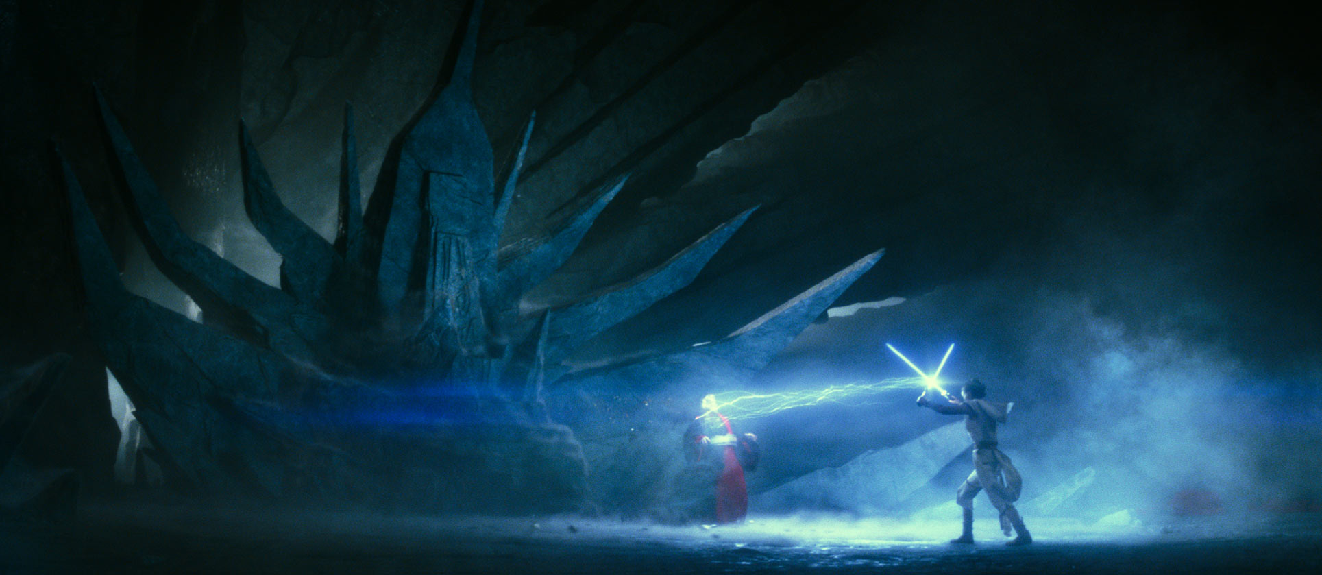 Following a year of training under Organa, Rey's light side powers became considerably more refined. Her telekinetic prowess had grew to the level where she could levitate both herself and large piles of stone into the air and was strong enough to slowly tug a prison transport that carried Chewbacca to the ground using the Force despite considerable effort, although Ren was able to hold her to a standstill using his own power. When she faced Ren, Rey blocked his lightsaber strike with the Force, which he would soon replicate on her own attack. During her fight with Palpatine's Sith Royal Guards, Rey was able to redirect some of the blaster bolts fired at her at another guard, killing them instantly, and knocked down and tossed him off the cliff with telekinesis. Additionally, Rey became capable of leaping across great distances, which she would use to avoid Ren's fighter and to avoid a tidal wave when fighting Ren for the last time. Using the Force, she was able to heal Kylo of a mortal wound, even causing the scars she had previously inflicted on him to vanish as well. Rey's lightsaber skills had vastly improved as well to the point that, bolstered by the strength of all the Jedi, she was able to block Palpatine's Force lightning with Leia Organa's lightsaber. By combining Leia's lightsaber with the Skywalker lightsaber, Rey managed to reflect Palpatine's Force lightning back onto him in order to disintegrate Palpatine, destroying his throne and collapsing the chamber that they were in on top of the cultists of the Sith Eternal.[7]
