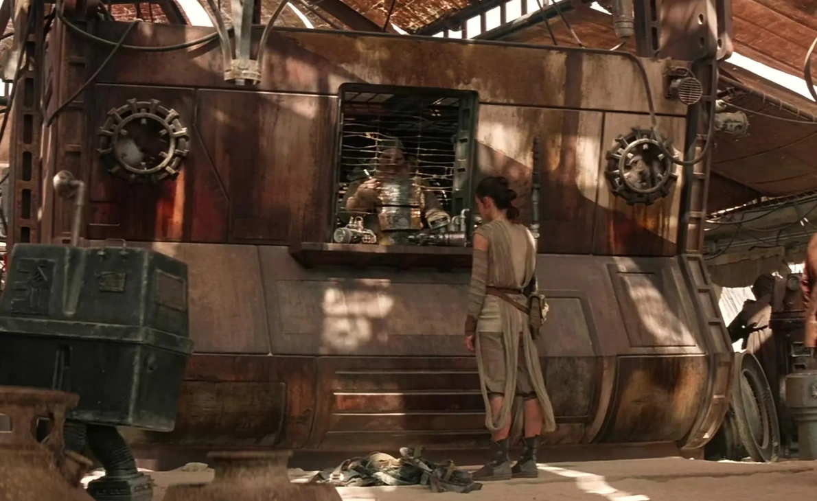 At some point, Rey was salvaging a battle cruiser when a sandstorm forced her to retreat to the Hellhound Two, where she decided to wait out the storm by practicing on her flight simulator. The next day, after trading with Plutt for rations at the Concession Stand, she took her speeder out to the Starship Graveyard, where she decided to climb the Spike, the keel of an Imperial ship that had crashed into what would become the Crackle. From her perch, she spotted a ship that, upon closer inspection, she realized to be a reasonably intact Ghtroc 690 light freighter.[26]
