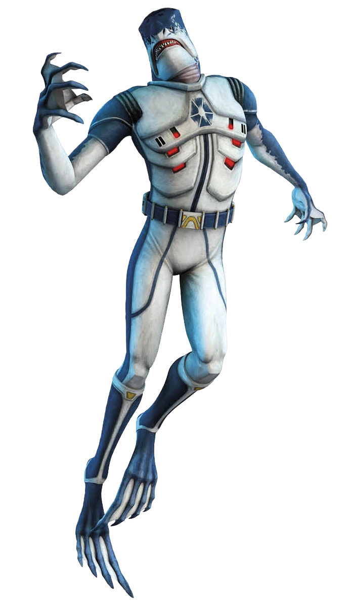 With Lee-Char still at large, Dooku was still not satisfied and ordered Tamson to use any means necessary to draw him out of hiding. The commander forced Skywalker and Fisto in cages constructed of electrical Mon Calamari eels and then tortured them for Lee-Char's location. The Jedi refused to reveal anything however, and Tamson was forced to report his failure to Dooku, while also telling the Sith that his squad of several Karkarodon enforcers had arrived on Mon Cala to aid in holding the planet. Returning to his prisoners, he attacked Amidala and bit down upon her helmet, creating a crack that slowly let water into her diving suit.[5]