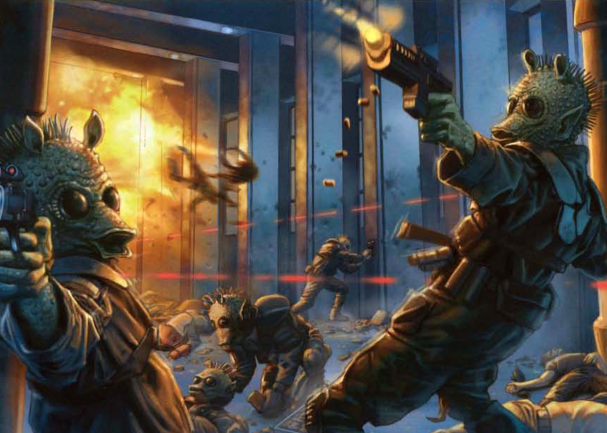 For what many would consider a vicious and bloodthirsty species, Rodians were renowned for their drama. Rodian Theater began as a simple series of staged fights, encouraged by Grand Protector Harido Kavila as a way for his people to burn off their aggression. Over time, it developed into a vibrant—albeit violent—theatrical tradition. Though not as honored a profession as hunting, each clan had at least one troupe of actors that performed clan legends. Because actors were barred from directly seeking political power at home, drama became an acceptable way for dissident elements to challenge established ideas.