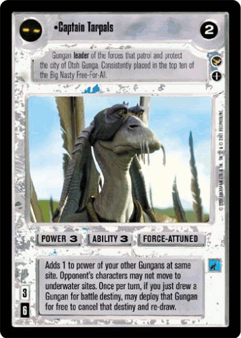 Their friendship was strained when[6] Tarpals became a member of the Gungan Grand Army, like all male members of his family.[5] Tarpals' gang scattered, leaving Binks to fend for himself.[6] During peacetime, Tarpals served as leader of the security forces of the Gungan underwater capital city Otoh Gunga, which required him to conduct patrols on top of his kaadu.[5] His role involved protecting the city from the giant underwater predators that shared its waters, and as such Tarpals name was frequently mentioned in reports gathered by Galactic Republic xenosociologists. Tarpals saw many threats against the Gungans pass, although none would test his mettle as much as Binks.[8]