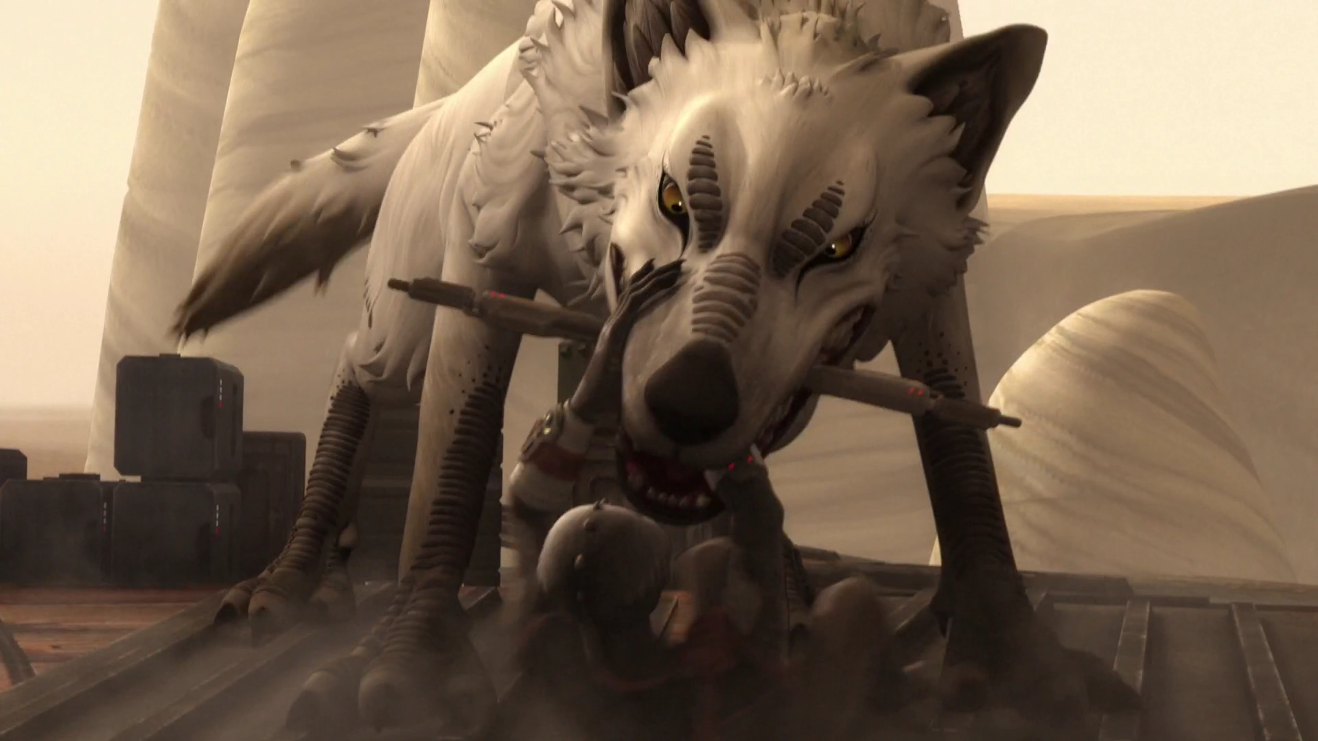 Rukh accompanied Pryce on an invasion of the rebel base. Ryder Azadi nearly shot him, but decided to maintain his cover and let him go. Rukh fought with Ezra Bridger. When the rebels retreated into the cave, Rukh followed them with his men, and found Bridger standing in the dark. When Rukh taunted Bridger about his "army," Bridger ignited his lightsaber, revealing a pack of Loth-wolves, terrifying him. In the ensuing battle, he was thrown off the encampment by the White Loth-wolf. While he survived the plunge, he lost his electrostaff.[10]