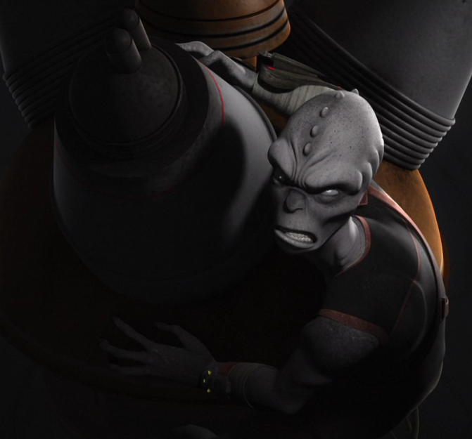 Upon arriving at the crash site, Rukh smelled the Lasat rebel Garazeb Orrelios, as well as Ezra Bridger and Jai Kell, nearby where they were retrieving the drive. As the assassin approached the scene, Bridger attempted to stall him by claiming that he and Kell, who were both disguised as scout troopers, had just finished searching the area. The ruse did not work, and Rukh attacked the two. During the fight, he realized that Bridger was a Jedi when he used the Force to fling him into a rock. The two escaped on a speeder bike, with Rukh pursuing. Meanwhile, Orrelios had evaded the assassin and escaped with the hyperdrive in an Imperial Troop Transport.[4]