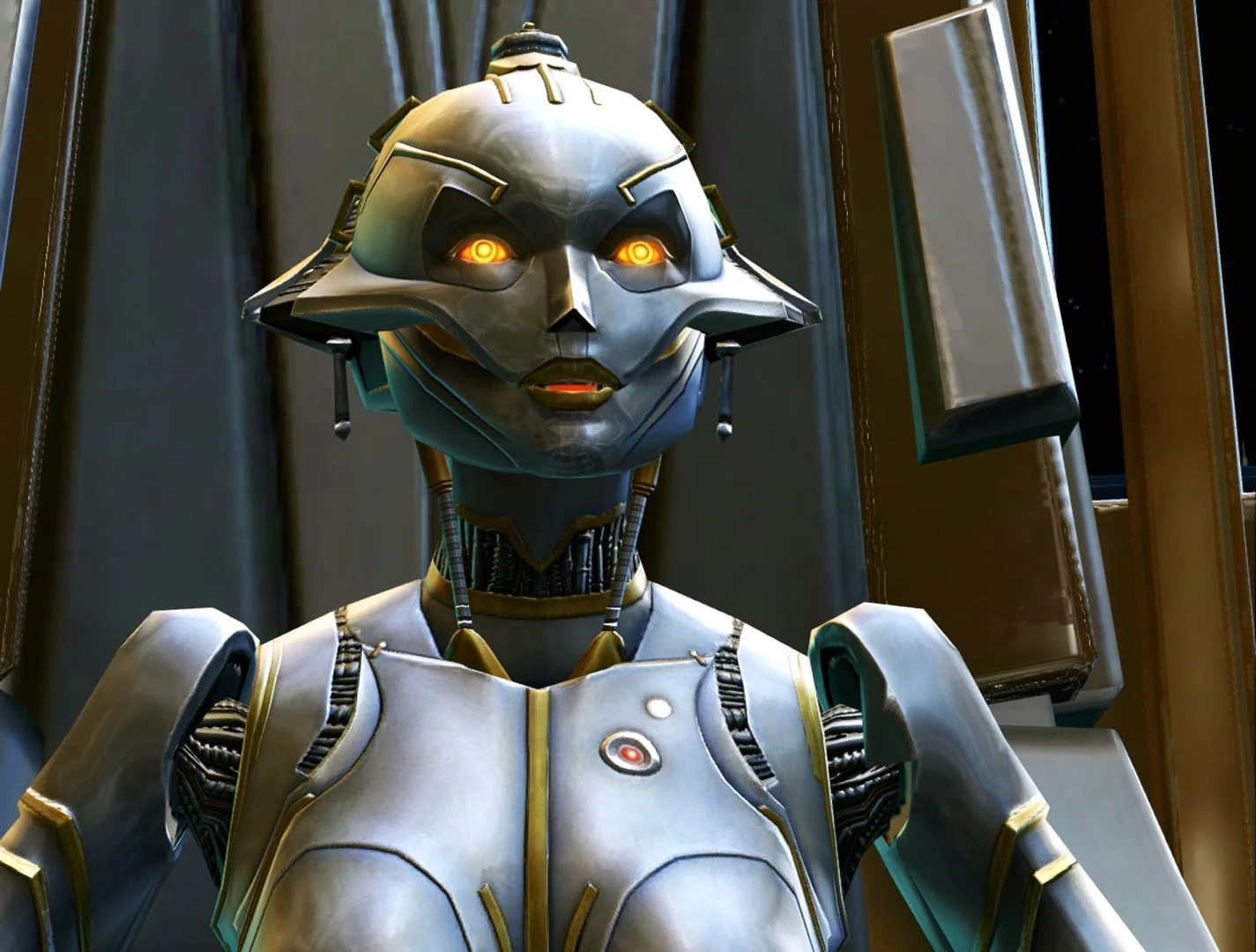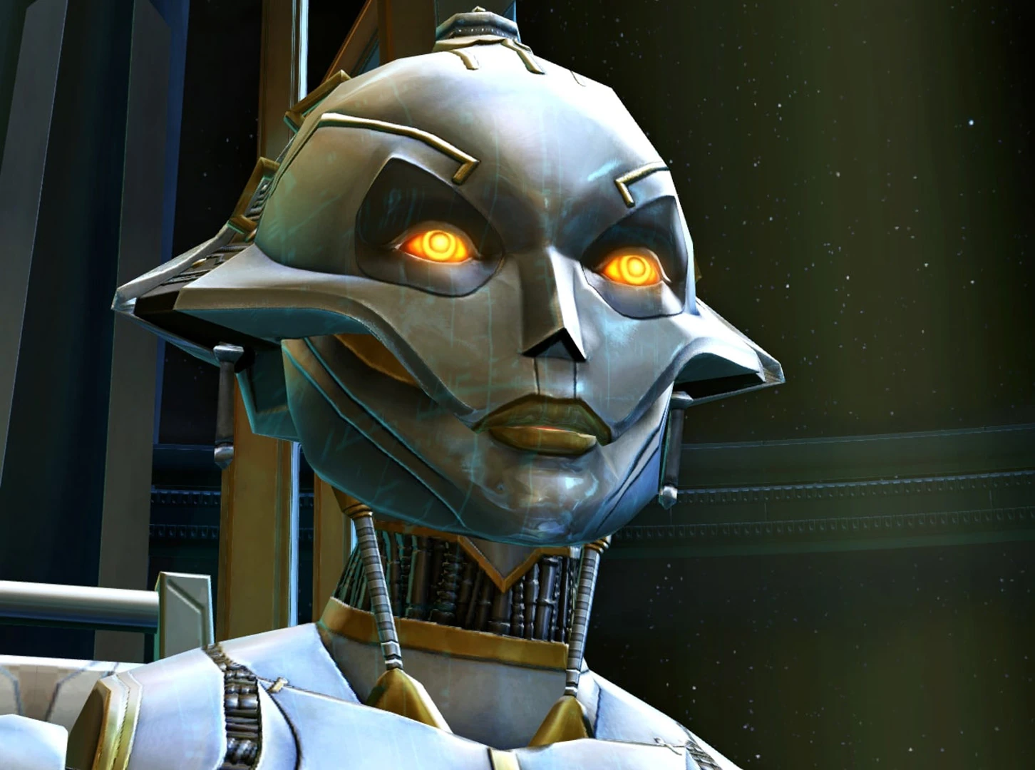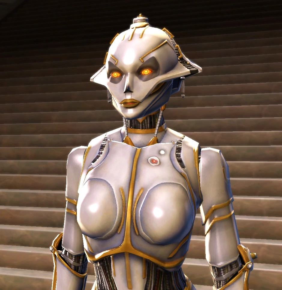 SCORPIO appears in Star Wars: The Old Republic as a companion character for the Imperial Agent class, voiced by Deborah Kara Unger. A melee companion armed with a techstaff, she is the last companion to join the Agent's crew and had relatively little importance in the story after joining the Agent on Belsavis.[3] However, she later becomes a major character in the Knights of the Fallen Empire and Knights of the Eternal Throne expansions, where her origins are revealed and SCORPIO becomes integral to the main plot, at one point becoming an antagonist before allying with the player once again. First returning in Chapter VII: Lady of Sorrows, SCORPIO becomes available as a companion for all classes after completion of Chapter IX: The Alliance, now as a ranged companion armed with a blaster rifle. After Chapter XV: The GEMINI Deception she becomes permanently unavailable as a companion regardless of player's future choices; though players can use a terminal on Odessen to reclaim her as a companion, this is considered not part of the storyline. Two customizations for SCORPIO are available from Cartel Market packs, one changing her appearance to gold-plated with white eyes, and the other to black-silver-and-orange plated with yellow eyes. During both expansions if the player is an Imperial Agent, they will have unique interactions with SCORPIO, where both can reminiscence on their past experiences on Belsavis and beyond.[23]
