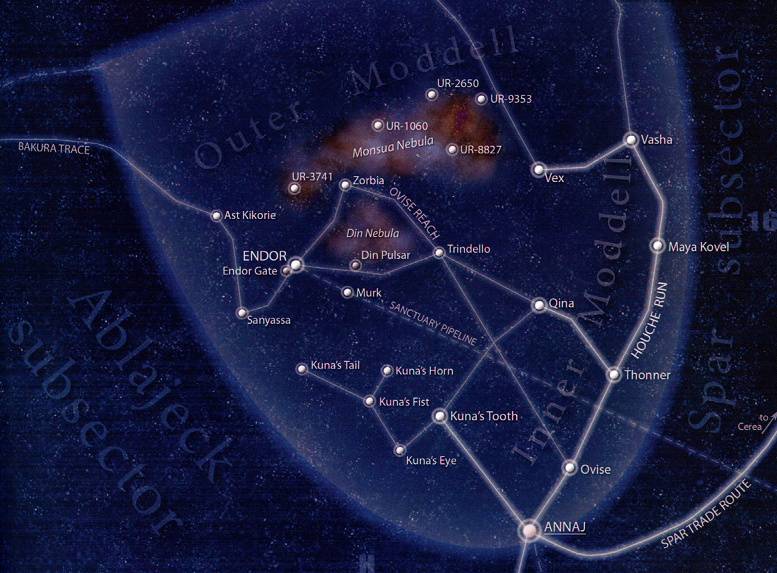 The Sanyassans evolved on the world of Sanyassa IV, a temperate planet located in the Moddell sector,[8] one of the three galactic subsectors that made up the Inner Zuma Region of the Zuma sector in the Outer Rim Territories. Like the rest of the worlds in the sector, Sanyassa IV was ignored by the wider galactic community for most of its history, as it was considered a part of the Unknown Regions until the last centuries of the Galactic Republic.[14] Millennia before the Galactic Civil War, the original Sanyassans were a much more advanced society than their descendants. Through time, the Sanyassan culture devolved into a might-makes-right kleptocracy.[8] According to the Ayrou, a peaceful species from the nearby world Maya Kovel, that devolution may have been the consequence of the Din supernova that led to the creation of a pulsar around 5000 BBY,[14] a cataclysm from which the Sanyassans never fully recovered.[8]