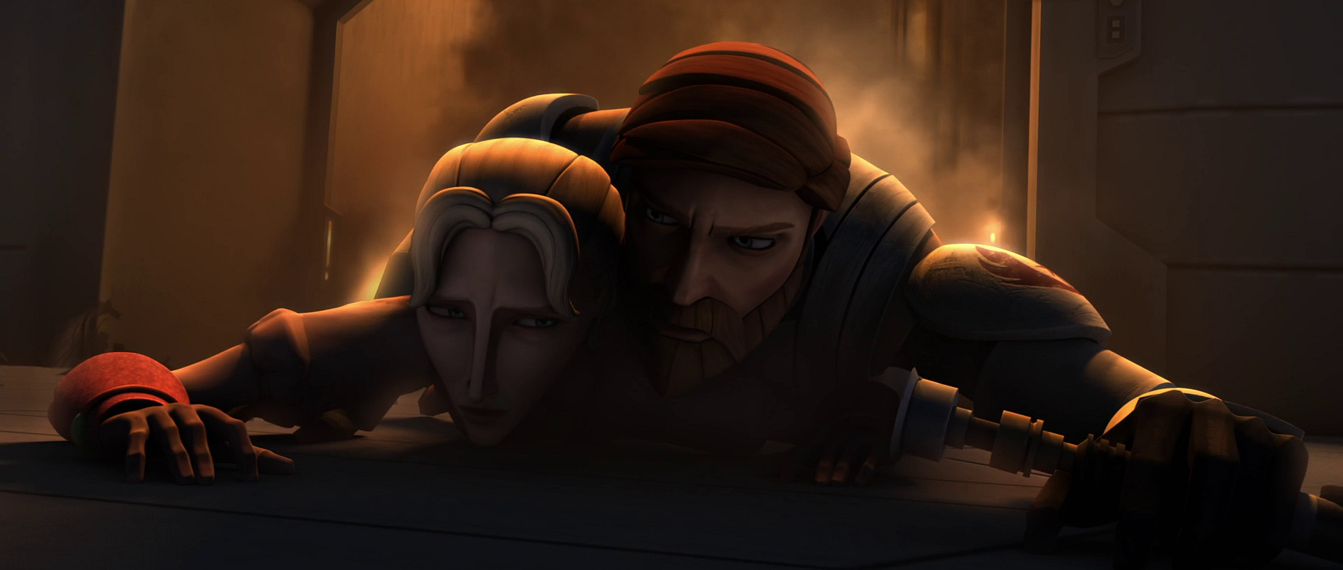 Satine and Obi-Wan's anger at each other peaked aboard the Coronet, where their arguments turned into a physical standoff. Once they came under attack from the probe droids, however, they put aside their differences and fought side-by-side again. As the situation escalated and Kryze was taken captive by Prince Merrik, the duchess broke from her stalwart facade and confessed to Kenobi that she had loved him since the civil war and still did, and he admitted to her that he would have left the Jedi Order for her had she simply asked. Despite opening up to each other about how they felt for the first time, they didn't get a chance to speak about it further as Satine had to focus on her diplomacy.[11] In her struggle to preserve the peace and neutrality she had brought to Mandalore, Kryze inadvertently pushed Obi-Wan away, but he remained at her side even through her anger and difficulty with Republic officials.[10]