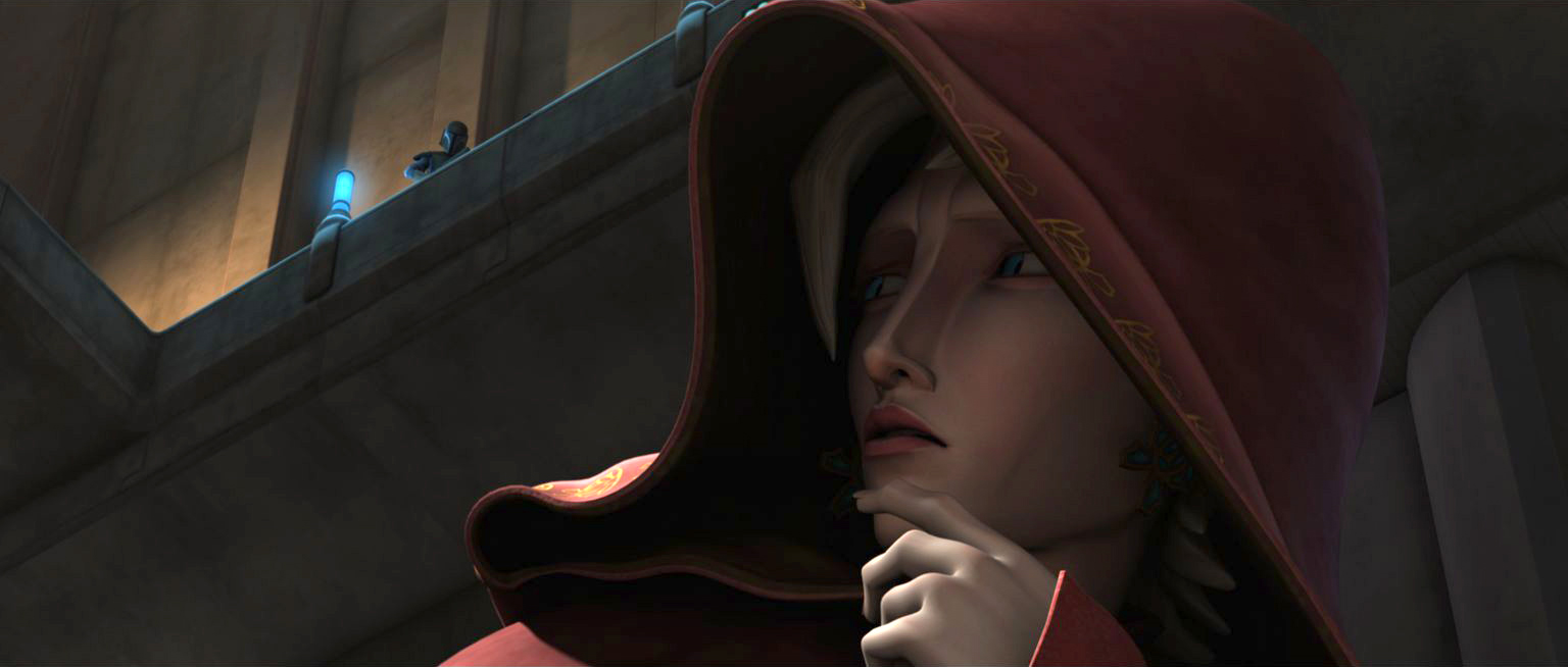 Obi-Wan's unwillingness to send aid angered Bo-Katan, who reminded him of what Maul had done to Mandalore. Bo petulantly referenced Obi-Wan and Satine's relationship, pointing out that she thought Satine meant something to Obi-Wan. Kenobi remained stagnant in not committing to helping Bo-Katan, but told her that Satine still meant something to him, though he added that he wasn't going to let his feelings for her cloud his judgement. As he left to consult the Council, Bo angrily told Ahsoka that asking for help was a waste of time. With some quick negotiations, Ahsoka managed to secure a division of clone troopers to take to Mandalore to help Bo-Katan oust Maul from the throne. They managed to enter Sundari with relative ease, quickly taking strides to take hold of the city.[23]