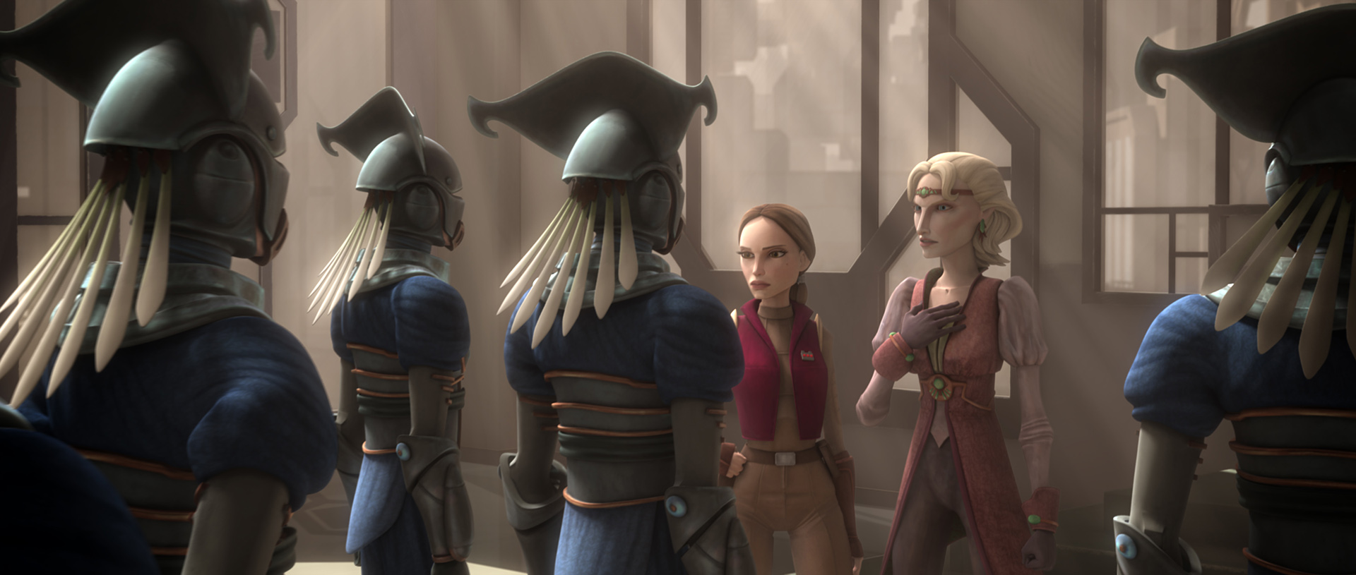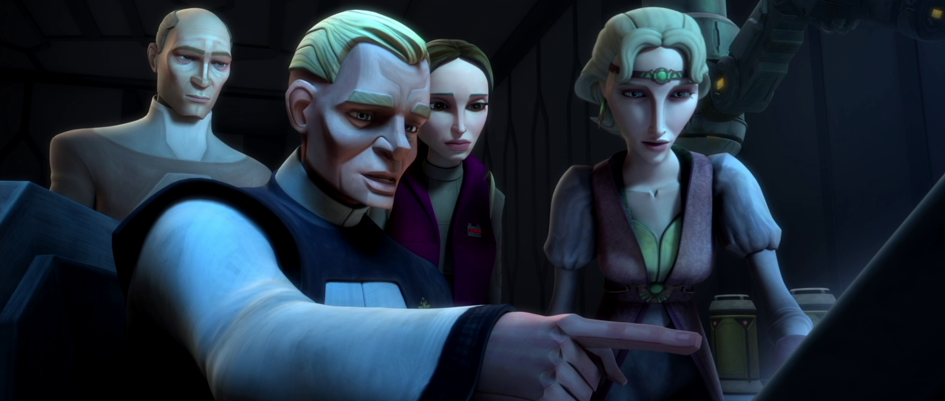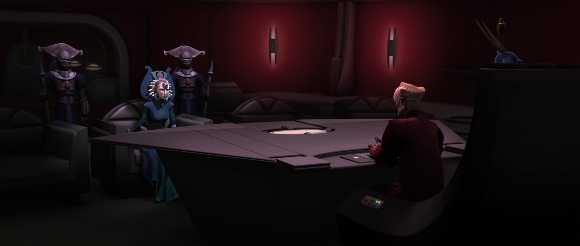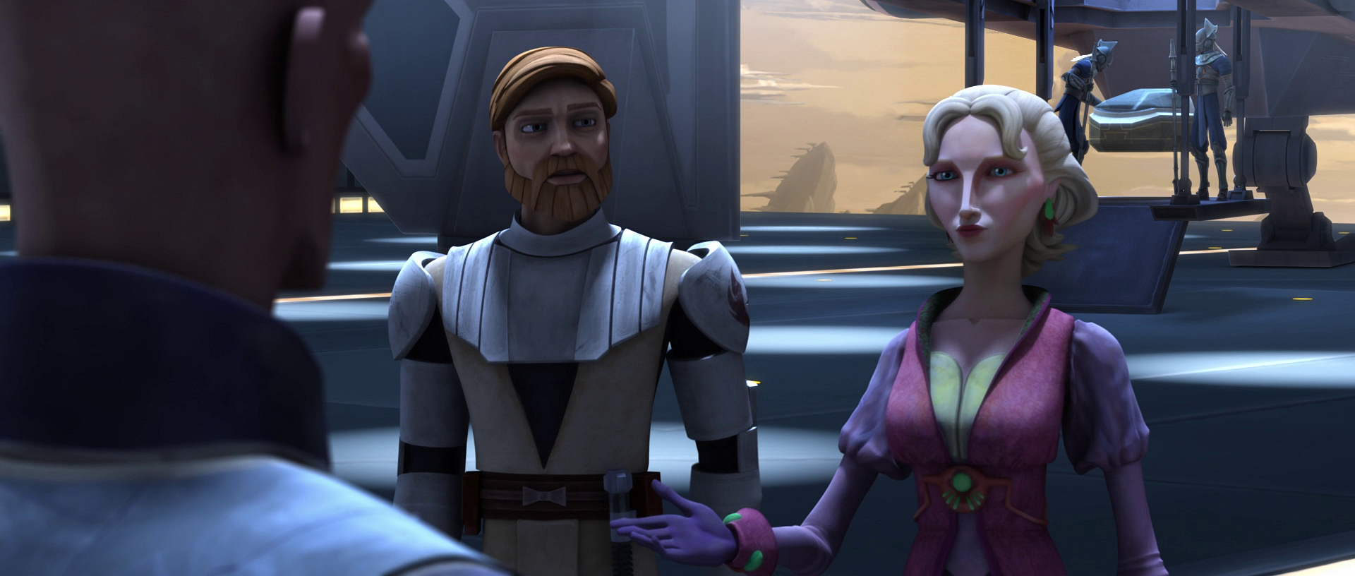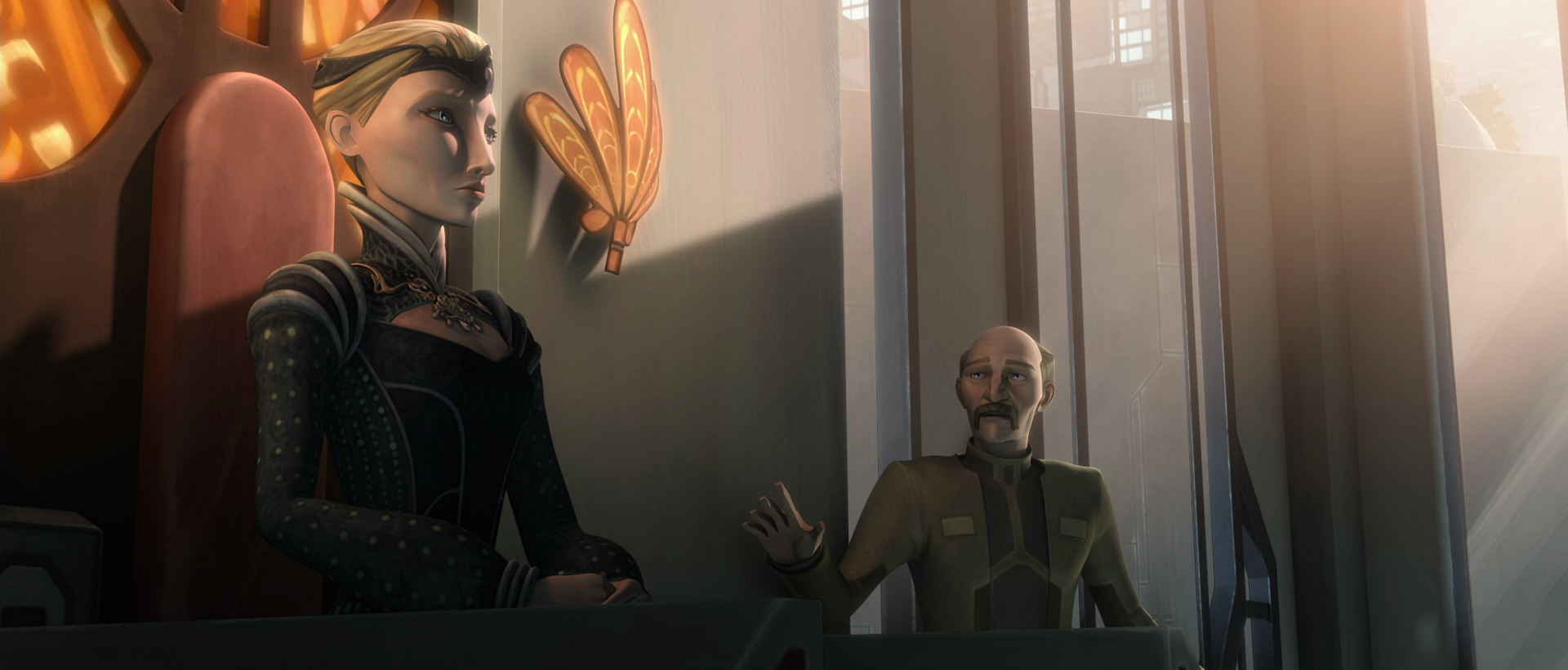 Duchess Satine and Senator Merrik during their meeting with Obi-wan Kenobi.