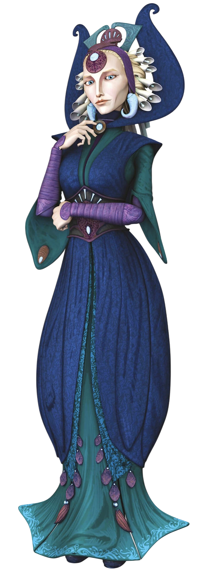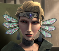 Satine Kryze, a human female, had short blond hair, piercing blue eyes, and pale skin, along with a slender build and defined features.[22] Satine always took care to present herself with dignity, and she reflected that in her appearance.[14] Satine fashioned her hair in a Kalevalan style, and in her clothing made use of soothing[5] and rich colors with floral-inspired designs that were reminiscent of the forests and lakes that once populated Mandalore's surface. Her elegant clothing was not worn out of vanity, but was strategically chosen to reflect Mandalore's past beauty and remind those who saw her of what the planet once was and what it could still be.[14]
