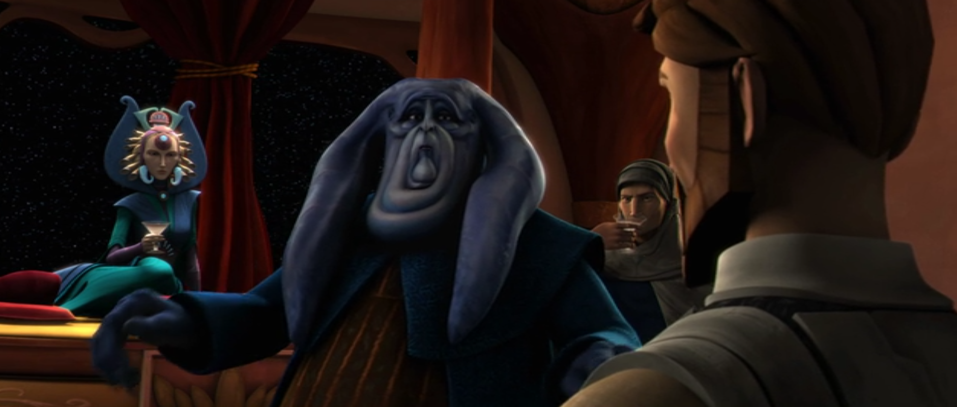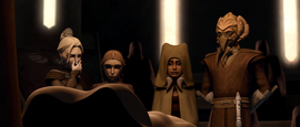 Senator Taa attempts to stop Satine and Obi-Wan's arguing.