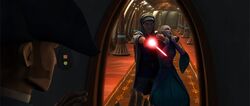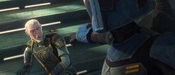 The rumors of Kryze building an army for the Confederacy emboldened following a terrorist attack on a Republic cruiser. The terrorist in question was seen by holographic feed wearing the traditional armor of the Mandalorians. The Jedi High Council was concerned about the incident and sent Obi-Wan to meet the duchess and investigate the situation. Kenobi arrived at the Royal Palace, where he was greeted by Prime Minister Almec. As the two waited for Satine, Almec explained to Kenobi that Mandalore's warrior past was behind them, emphasizing that the duchess valued peace more than her own life. Shortly after, Satine, accompanied by Merrik,[6] who was now the Senator of Kalevala,[11] entered the throne room and quipped about how Kenobi was once again on Mandalore to help her.[6]