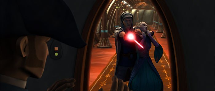 Holding Duchess Satine captive, Merrik murders the crew of the Coronet.