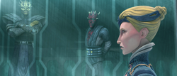 Outside the Chancellor's office, she was immediately greeted by Obi-Wan, who had heard about her accident. Kryze expressed her disgust with the Chancellor and Vice Chair, but found no words to describe them. Kenobi persisted in asking if she was well, and she assauged him that she wasn't hurt in the accident, though added that she hadn't told him to keep him from worrying. Kenobi laughed and joked that she had failed to stop him. Both Satine and Obi-Wan agreed that the attack proved that Satine had enemies on Coruscant as well. Obi-Wan intuited Satine's intent to follow up on the accident herself, but she didn't waver to his protests and told him that Republic authorities were not reliable. Obi-Wan tried changing her mind about being so self-reliant, telling her that she didn't need to be alone. As Kryze tried to explain her feelings, Senator Amidala approached the two. Amidala told Kryze and Kenobi that the Senate had completed its vote on the resolution, and had decided in favor of occupation. Kryze was confused and asked when the vote, which was meant to happen the following day, took place. Amidala told the duchess that, after the attempt on her life, the Senate had accelerated the vote and decided its outcome during Kryze's meeting with the Chancellor. Kryze, extremely upset at the sudden revelation, despondently told Obi-Wan that she was right not to trust the Republic.[10]