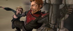 Kenobi removed his helmet and quipped that he did his own bidding. Seeing him, Kryze rushed from her seat and embraced him. Upon asking, she learned that Kenobi had come alone, and that the Jedi and Republic would not be of any help. Taking Kryze by the hand, Obi-Wan looked outside the cell to see if their path was clear. The two made their way to an elevator, where Satine asked him if he had a plan. Just as he replied that he did, the door to the lift opened they were met by one of Maul's soldiers.[3] Kenobi pushed Satine onto the elevator and pretended that she was still his prisoner, a scene that was reminiscent of their time on the run during the Mandalorian Civil War.[14] After a few moments of silence, the soldier questioned if there was a prisoner transfer, but was knocked out by Kenobi before he could figure out what was happening.[3]