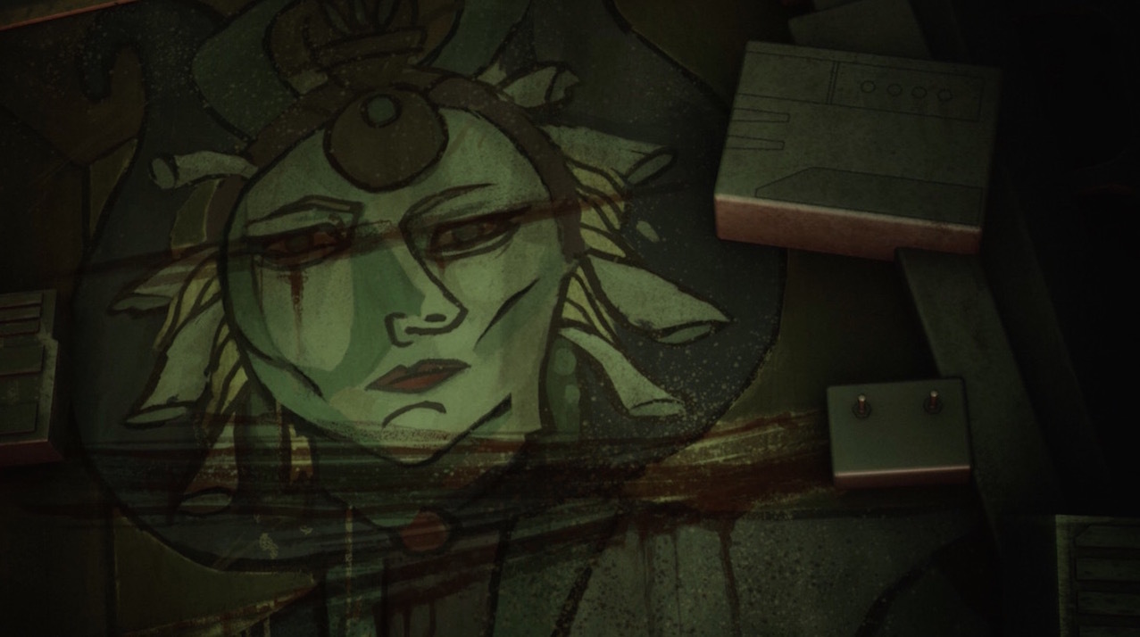 In the years prior to the Battle of Yavin, Maul had under his possession a painting of Satine which he kept in the Nightsister lair on Dathomir. Maul kept the painting as part of a large collection of items from his life, among them the Darksaber.[51] By 2 BBY,[52] the painting was heavily defaced, with the eyes and throat of Kryze scratched out and the overall artwork in poor condition. The painting was placed in a twisted shrine to the Darksaber and Maul's decades-old vendetta against Obi-Wan.[51]