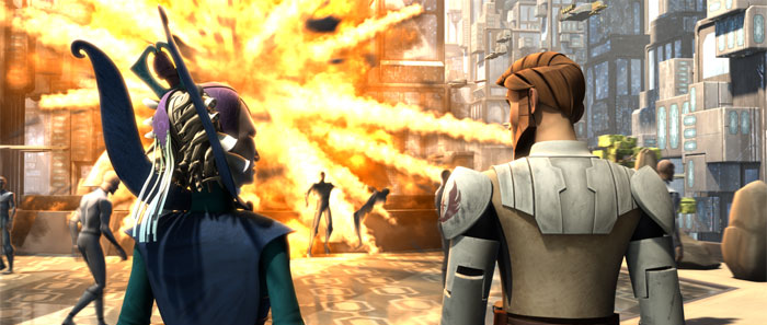 Obi-Wan and Satine narrowly escape a barrage of missiles.