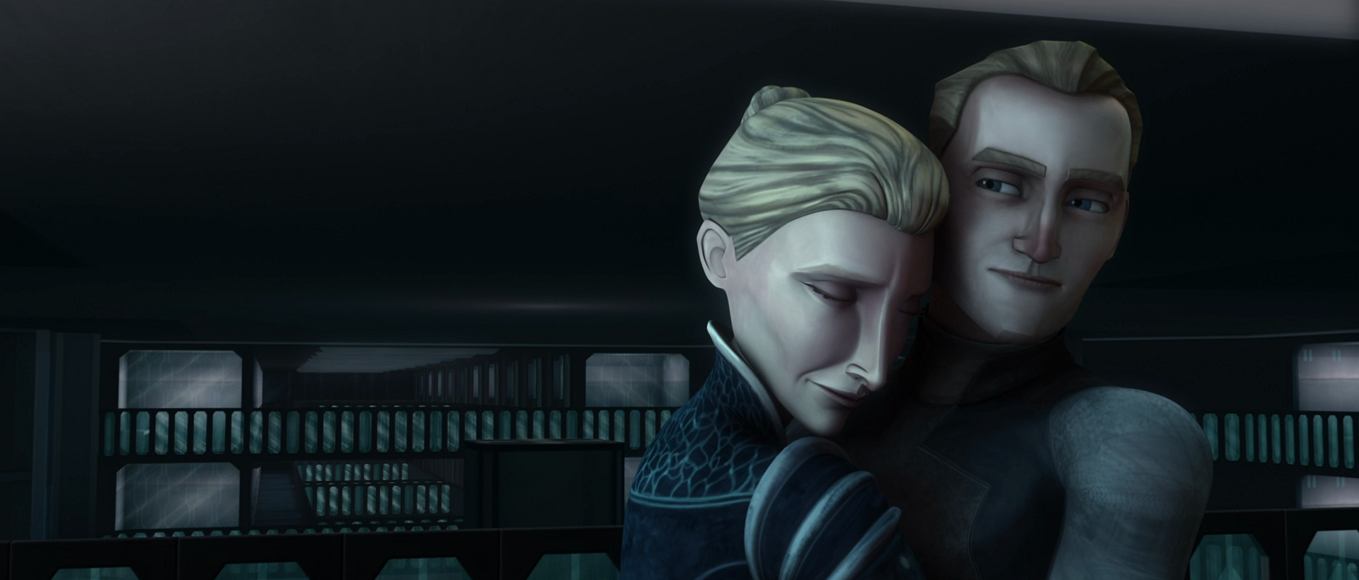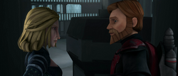 Kenobi found Merrik and Kryze on the bridge, where he told the senator that he was under arrest. Still holding Kryze hostage, Merrik explained that he had wired the ship's engines to explode. Kryze pleaded with Obi-Wan not to try to free her when everyone on the ship's lives were at stake. Merrik left the room with the duchess, closely followed by Kenobi. Once they arrived at the Separatist boarding ships, Merrik sardonically told Kryze to say goodbye to Kenobi. Kryze, believing that it would be the last time she would ever see Obi-Wan, told the Jedi that she loved him and had loved him since their time during the Civil War. Though he didn't think it was the right time or place, Obi-Wan confessed that had she asked him to, he would have left the Jedi Order. Merrik was annoyed by the display, but as he started to leave Kryze dug her heel into his foot and freed herself from his grip, taking his blaster in the process.[11]