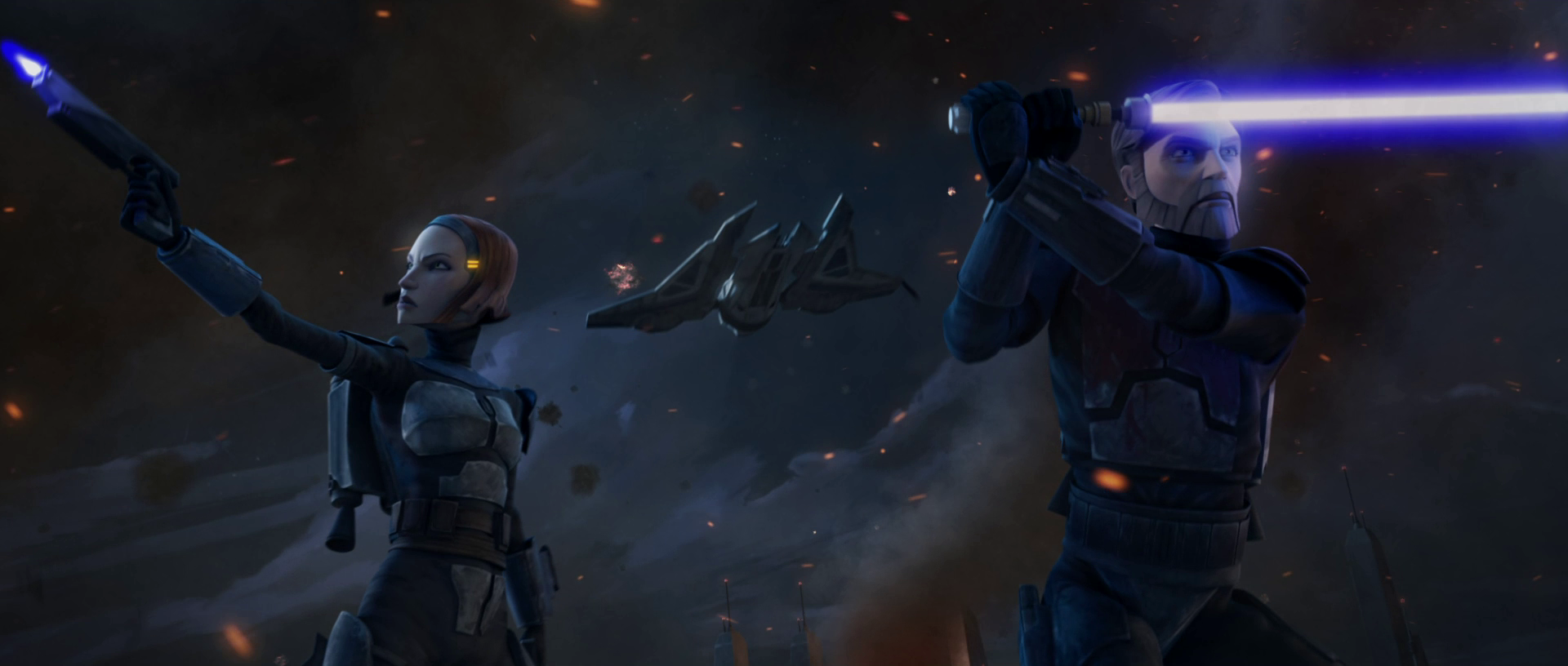 Bo-Katan Kryze raises the Darksaber to rally support against the Empire in honor of Satine.