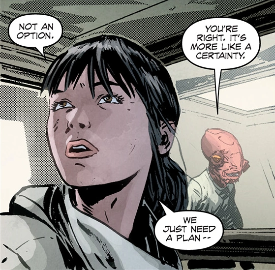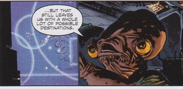 The three companions then resumed their quest to discover Ania's whereabouts and to ascertain the truth about her past. After Sauk and AG-37 ruled out most of the galaxy, the two speculated that Ania's kidnappers were traveling to a remote planet with a few small settlements where they could refuel without and questions asked. Jao was not sure that Ania's kidnappers were bounty hunters and wondered whether they would have gone to the nearest Triumvirate official. Still questioning Ania's innocence, Jao suggested that she had deliberately disappeared due to the seriousness of her alleged crime and the hefty bounty on her head. However, Sauk refused to believe that she was guilty until they heard her side of the story. He told Jao that nothing they had seen in AG's memory had convinced him to change his mind.[12]