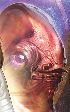 Sauk was a Mon Calamari who grew up on the planet Dac during the time of the Second Imperial Civil War. While he had trained as an engineer, he wanted some adventure offworld and apprenticed himself to an unidentified employer. While Sauk had every intention of returning once he had completed his education, the One Sith's genocide against the Mon Calamari species and the subsequent poisoning of Dac's oceans with viral spores made this dream untenable. Sauk lost contact with his family on Dac.[1] At some point, Sauk became unemployed and ended up on the streets of Carreras Minor, a planet in the Carreras system. He was treated with disdain by the indigenous Shifala, a simian species, who disliked the influx of Mon Calamari and Quarren refugees and nicknamed them "refugee scum", "flotsam", and "beggars." However, a young Human woman named Ania Solo vouched for him and secured him employment at an ice mining platform in the rings of Carreras Minor.[2][4]