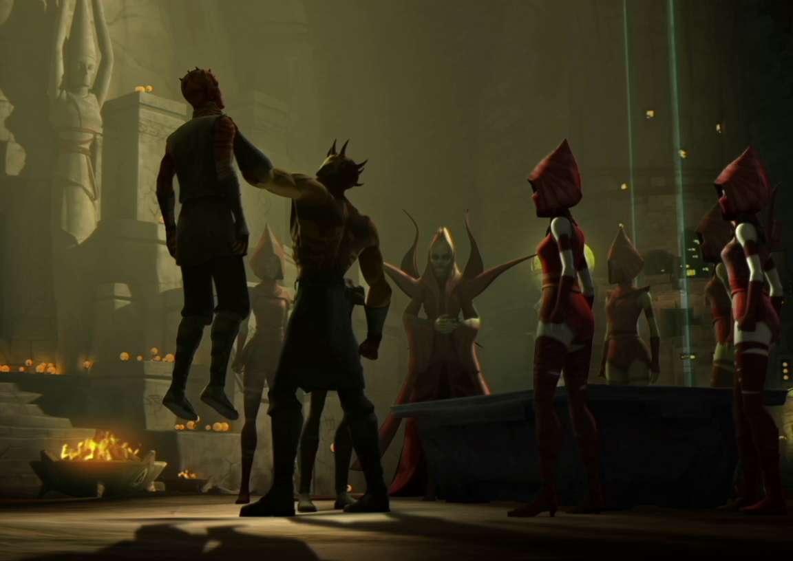 Maul advised Vizsla to gather allies to grow in strength to overthrow the pacifist rulers of Mandalore. As their first step to assembling what would become the Shadow Collective, Opress traveled with Maul, Vizsla, and Death Watch to Mustafar to meet with Black Sun leadership. Greeted by Vigo Ziton Moj, they were invited to the council chambers to meet with Xomit Grunseit. When he refused to join them, he commanded his forces to kill them and take their weapons and ships. Opress grabbed an advancing guard and snapped their neck, hurling the body onto the council table. When Maul delivered his ultimatum, but Grunseit once again refused, at which point Maul stepped back to allow Opress to finish the job. Hurling his double-bladed lightsaber, he beheaded the entire council, leaving Moj the lone Black Sun member left in the room. As de facto leader, Moj quickly agreed to their proposed alliance.[8]