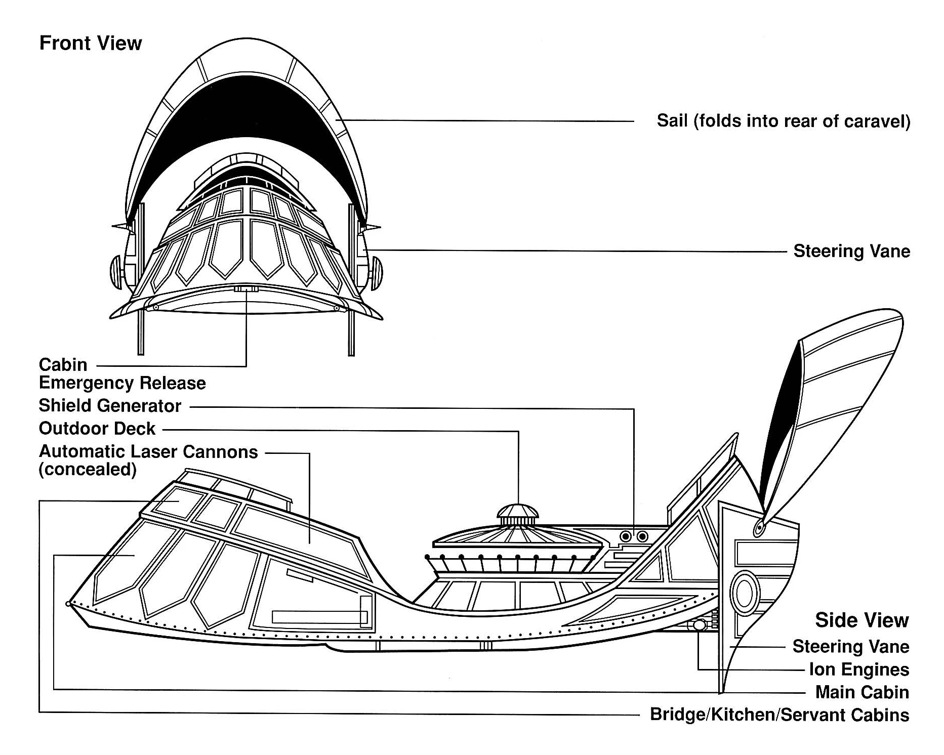Many caravels carried concealed weapons to lull potential enemies into a false state of security. The armored front of the ship could be opened up to reveal a view of space, while if there was an emergency, the whole cabin could be ejected. The caravel also contained a kitchen and four small servant cabins, which could not be ejected.